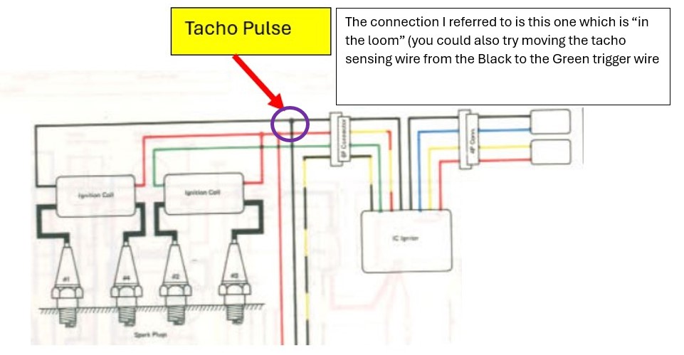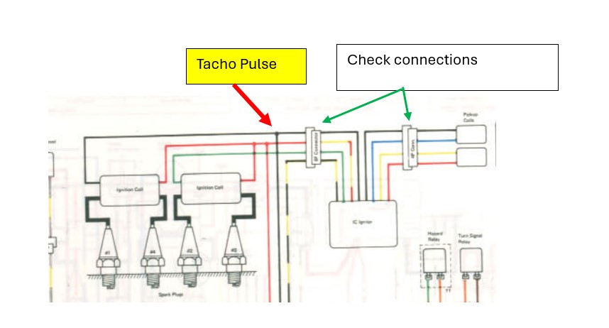 The tacho pulse comes from a "node" crimped connection in the loom for the ignition system. Over time these connections corrode. You could check that