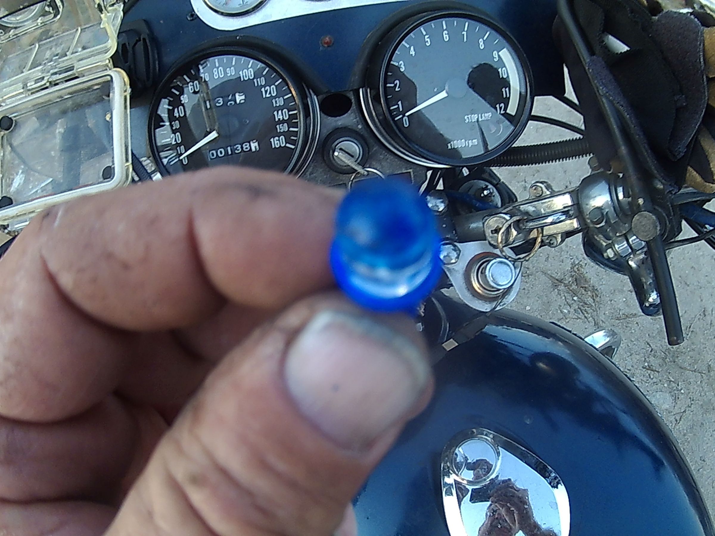The new gauges have different bulbs. I painted the tips blue for the small gauges. Now they're light blue LED's. I think I used too much. I painted four new bulbs with just a touch on the tips to add color to the Tach and Speedo. I'll get a shot of the little gauges when it gets dark.