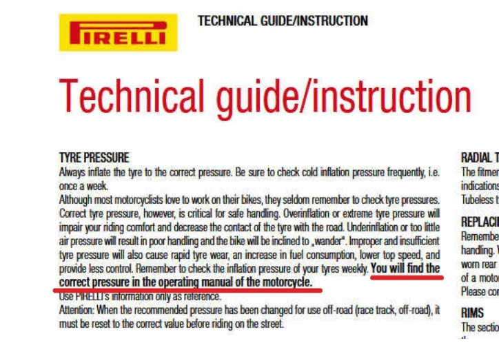 Metzeler and every other major motorcycle tire manufacturer recommends following the tire pressure recommendation of the motorcycle manufacturer. Many folks believe the old wives tales, urban legends, myths, etc, about using higher pressure in new tires on old bikes, but the fact is that the tire pressures for new tires are the same as those of old tires for the same model bikes. Here are images from the CURRENT web sites of motorcycle tire manufacturers. The tire manufacturers have a vested interest in ensuring their tires perform as well and as safely as possible, so they have no reason whatsoever to lie about what pressure to use. Ed