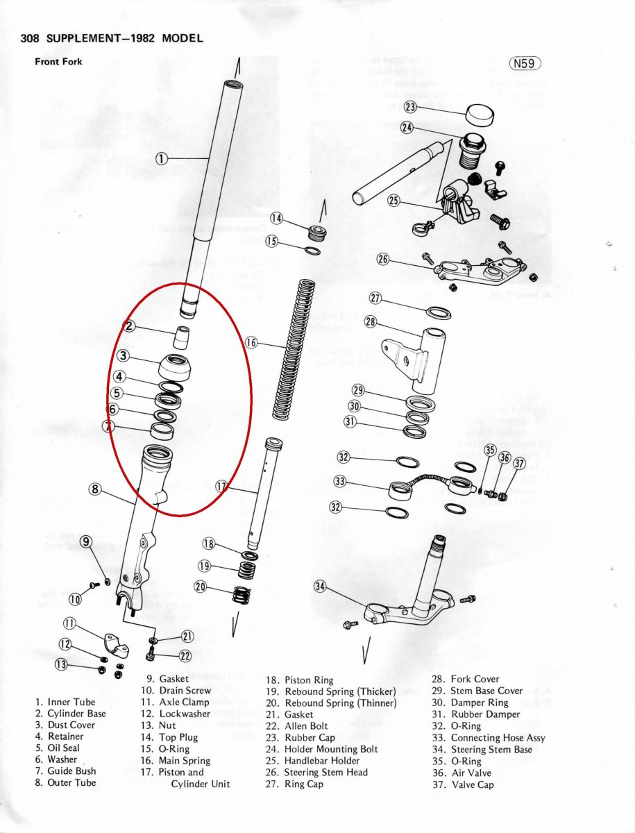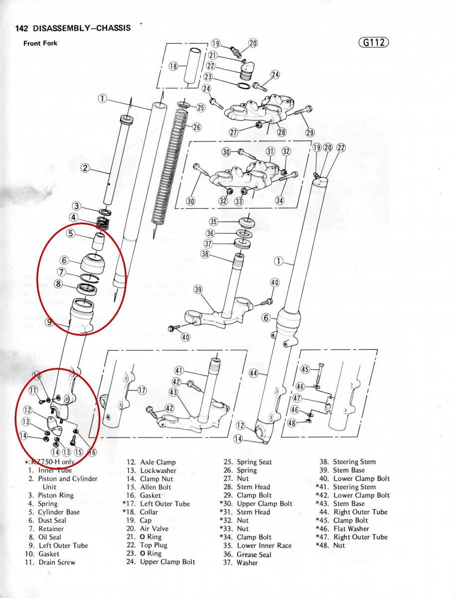 note: his bike is a 1981 650-D4 SR, so there are no diagrams for the forks. the 81 650 pdf manual covers the D4 & may be available on this site somewhere. the upper tubes were worn, so 750E fork tubes & fork seals were installed. the D4 forks are similar to the 750E, but they are not identical & some of the parts have not swapped or fit perfectly.