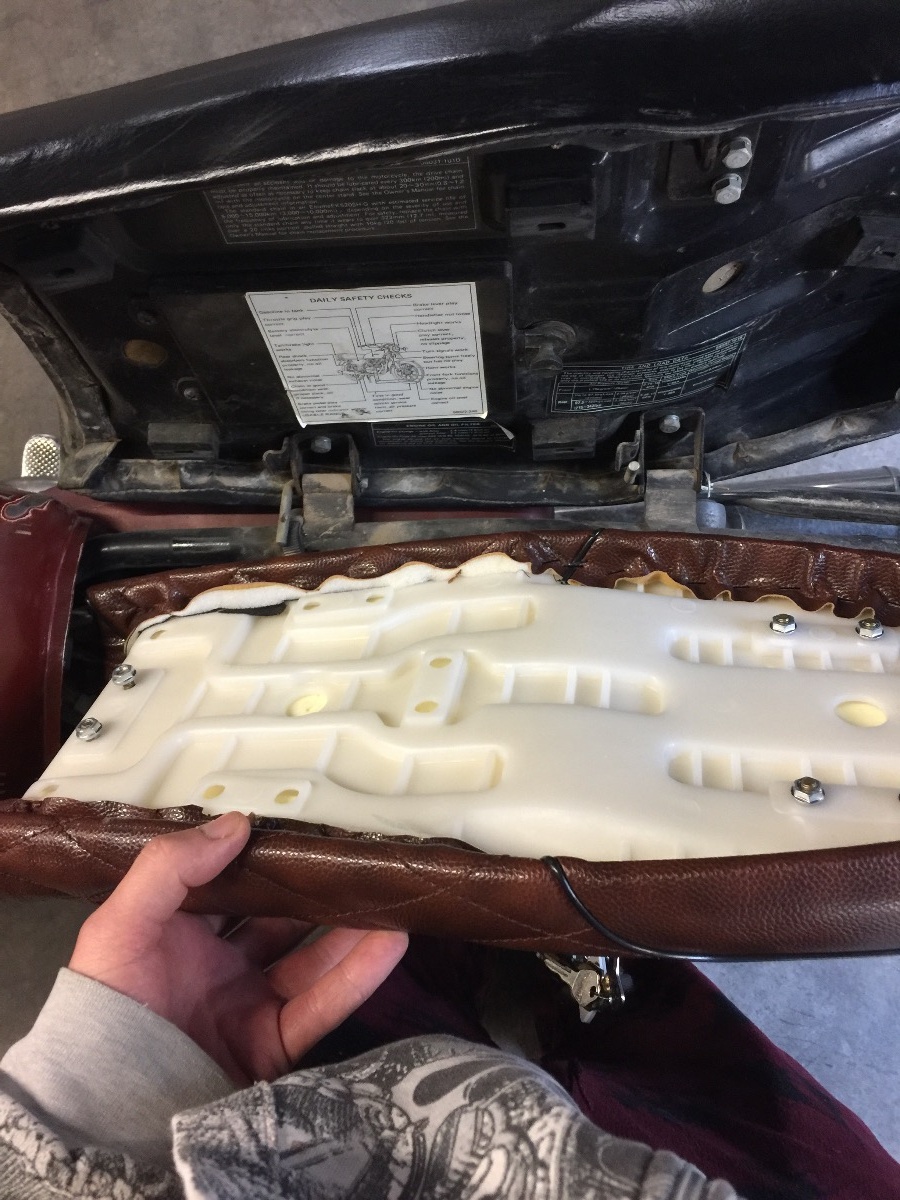 When I put a Hotwings Glass café seat on my XS650 I built a base out of wood and mounted the hinges to the wood. I doubt you can do that with the seat you have pictured.