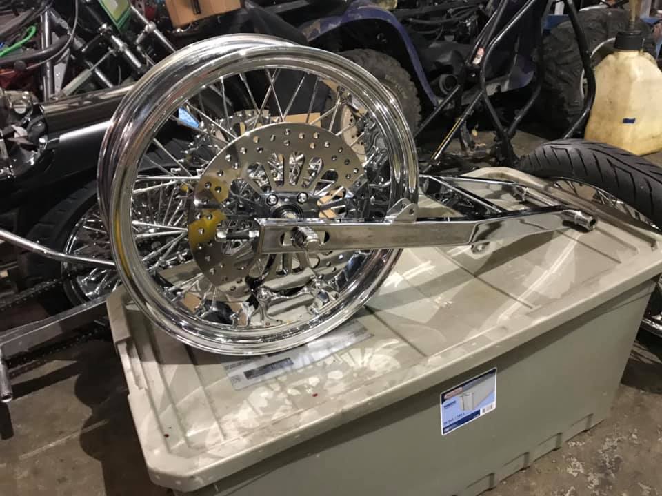 But Cheap parts! Believe it or not Harley! 18" x 5" x 180 wide wheel with 530 chain size which would help with clearance. disc brake, which you have.