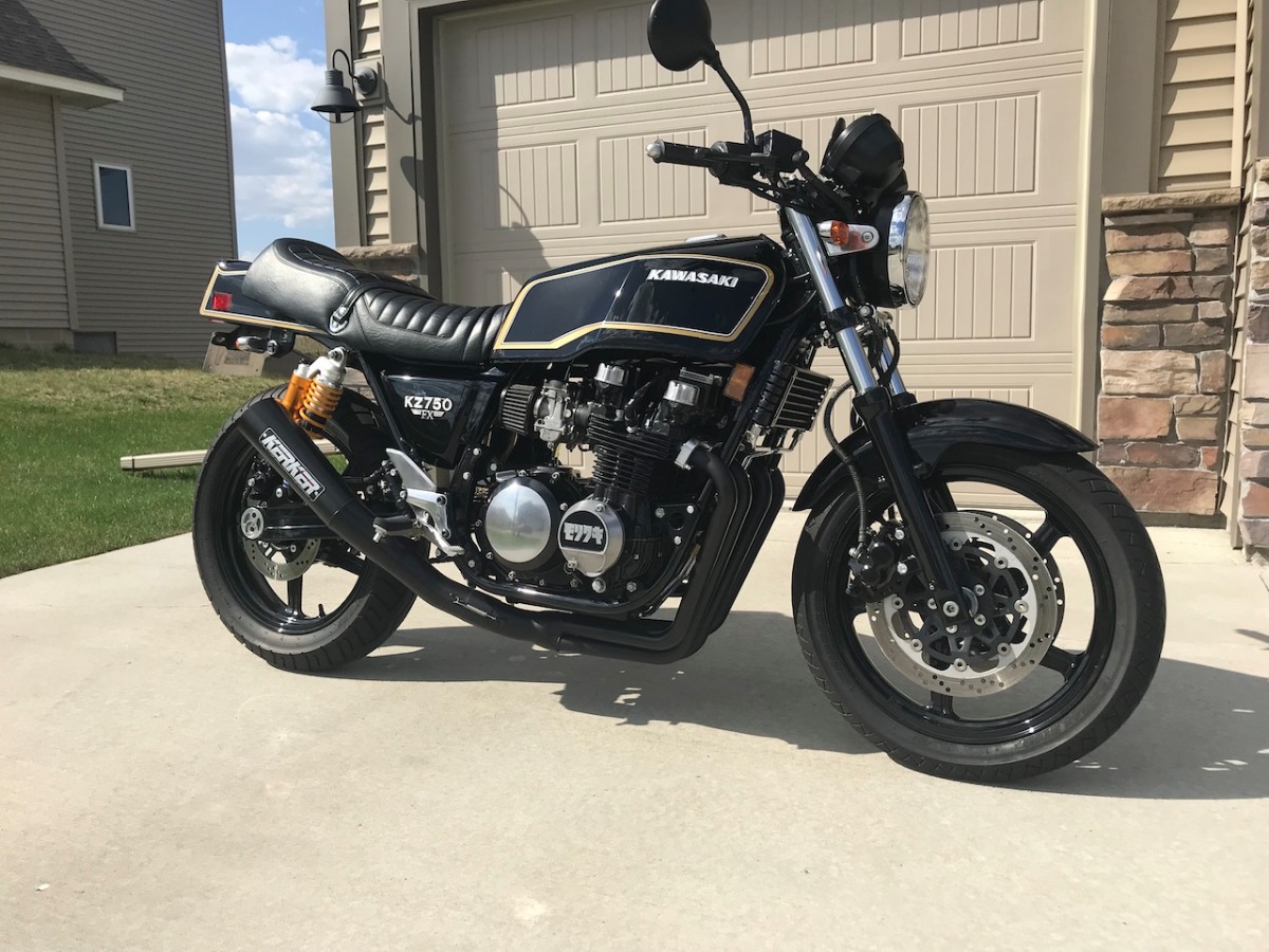 82' KZ750-R1 cafe racer style. Clip-on, Rear set, Fork-Brace, Mikuni Flat-slide (forgot the size), Kerker.
