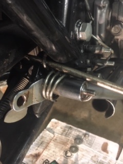 Photos of my rainy after noon project. Rear brake lever would not return and stop light was on so took the right foot peg off and nut holding the brake lever on its axle. Here is a long screw driver trying to pull back the return spring from the frame bracket.