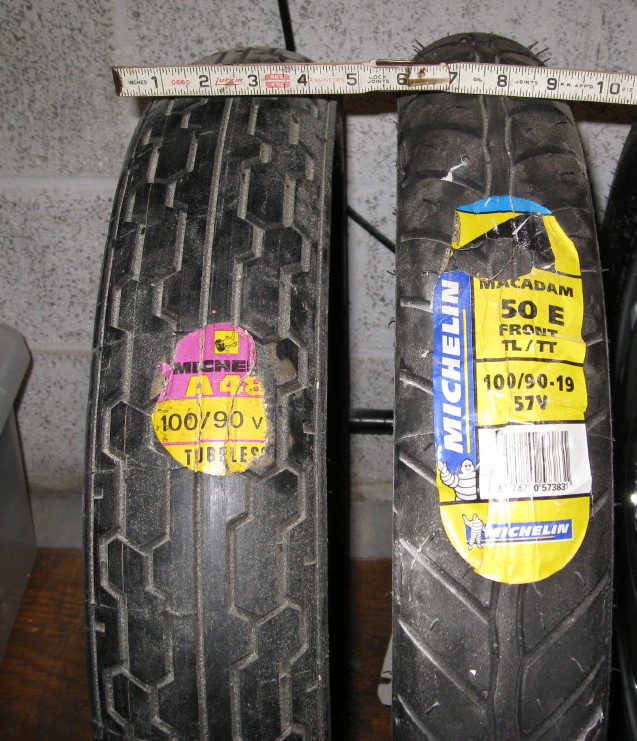Even though in theory the width of tires that have the same size molded on them should be the same, they are not. The width of tires from different makers, and even different model tires from the same maker can vary quite a bit even if the tire sizes are marked the same. Below are two front tires from Michelin. Both tires are marked 100/90-19. In theory they should be the same width, but they are not. Even when mounted on the rim the difference in tire width was obvious. I don't really understand why tire manufacturers aren't more consistent, but my experience has been that the actual tires widths can and do vary quite a bit even for tires marked the same. Ed