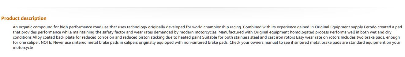 Notice those Ferodo pads are organic not sintered - that's good. If you look at the "Note" in the "Product Description" it warns about using other pads that are sintered on bikes that did not originally come with rotors intended for use with sintered pads. Image below shows that warning. Ed