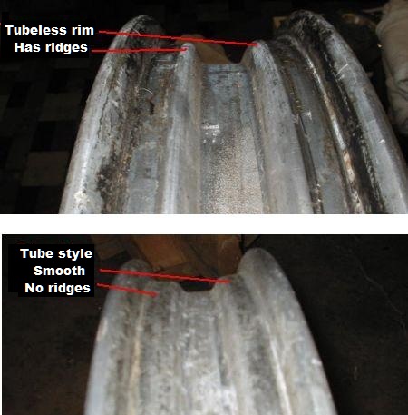 As an example, the rear wheel on my K1977 KZ650-C1 (and on some other models) has two rim lock holes in addition to the valve stem hole. Those holes are there to accommodate rim locks which will keep the tire from slipping on the rim during hard acceleration since that slippage can tear the tube valve stem off the tire (this happened to me on my BSA). Obviously, if no tube is used those rim lock holes will immediately leak air, but even if one was to weld them closed the valve stem hole is not made to accommodate a tubeless valve stem type. Besides that, even of one was to also modify the valve stem hole the wheel casting is not necessarily without small air leaks since it was built for a tube, and the wheel shape is not designed to hold a tubeless tire in place if the air pressure gets too low. Below is a picture of the humps that Nessism mentioned. Ed