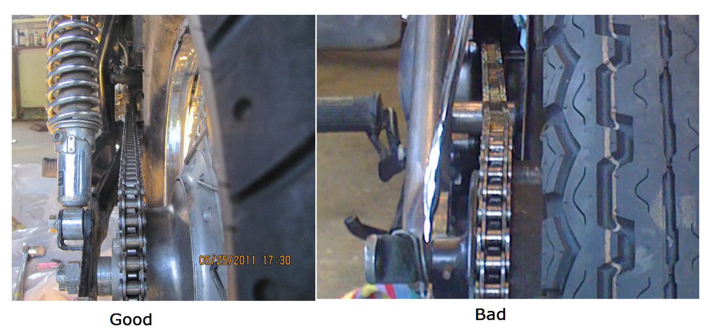Also, I found that my brake side rear mark is about 3 notches back while my belt side rear mark is about 4 notches back. Before I adjusted it, both were set exactly to the same point, just under 3 notches back. I'll try to take some more measurements but I'm thinking that the frame or swing arm may be bent.