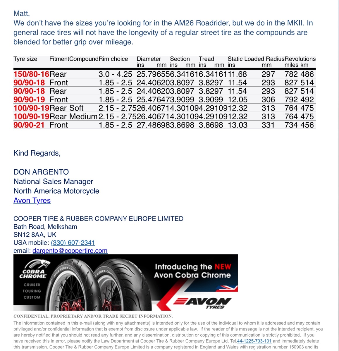 Here a screen shot of the response from Avon and you guys are correct again... looks like the ‘78 B2 will be getting the MKII’s in the fall.