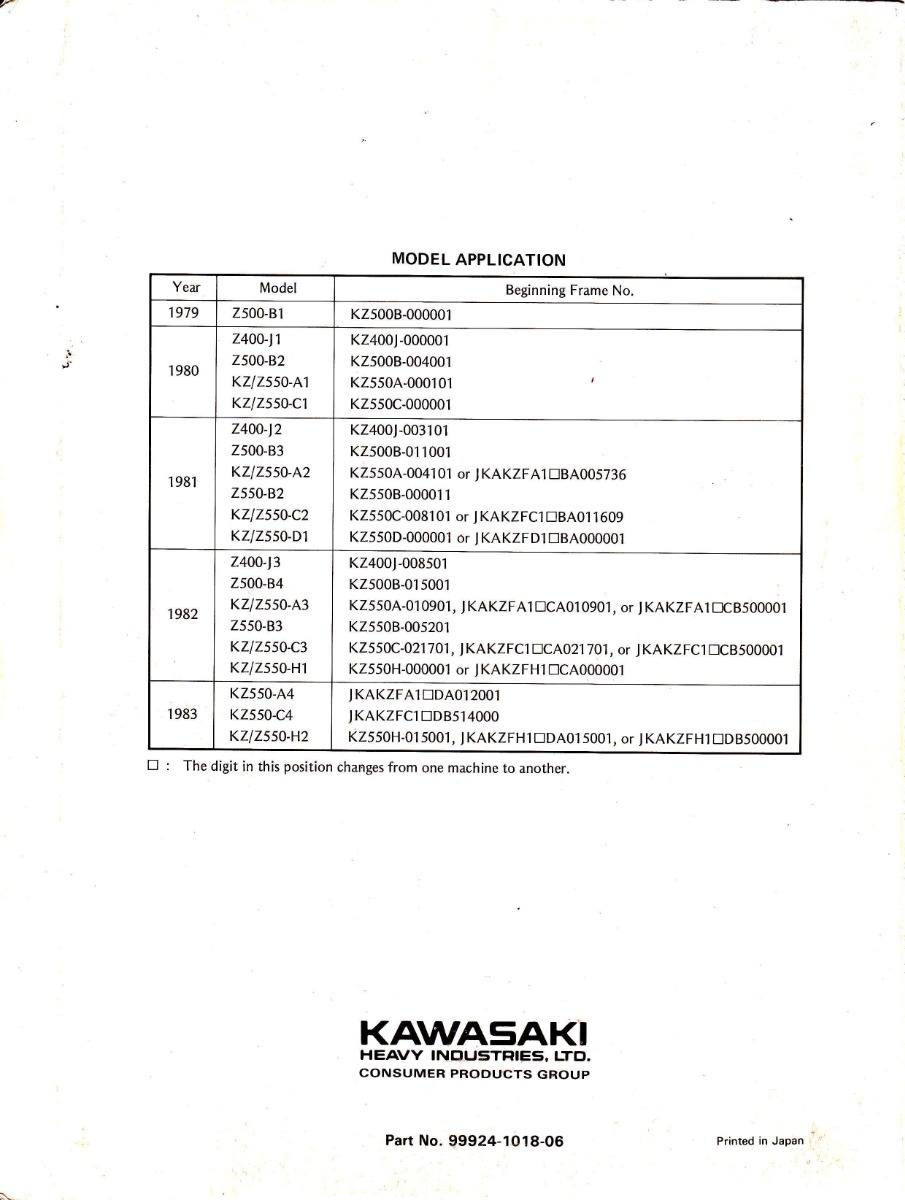 There is a PDF copy of the 550 service manual under the Articles tab here on KZR. On the back cover, there is a chart showing the vin range for each model year.