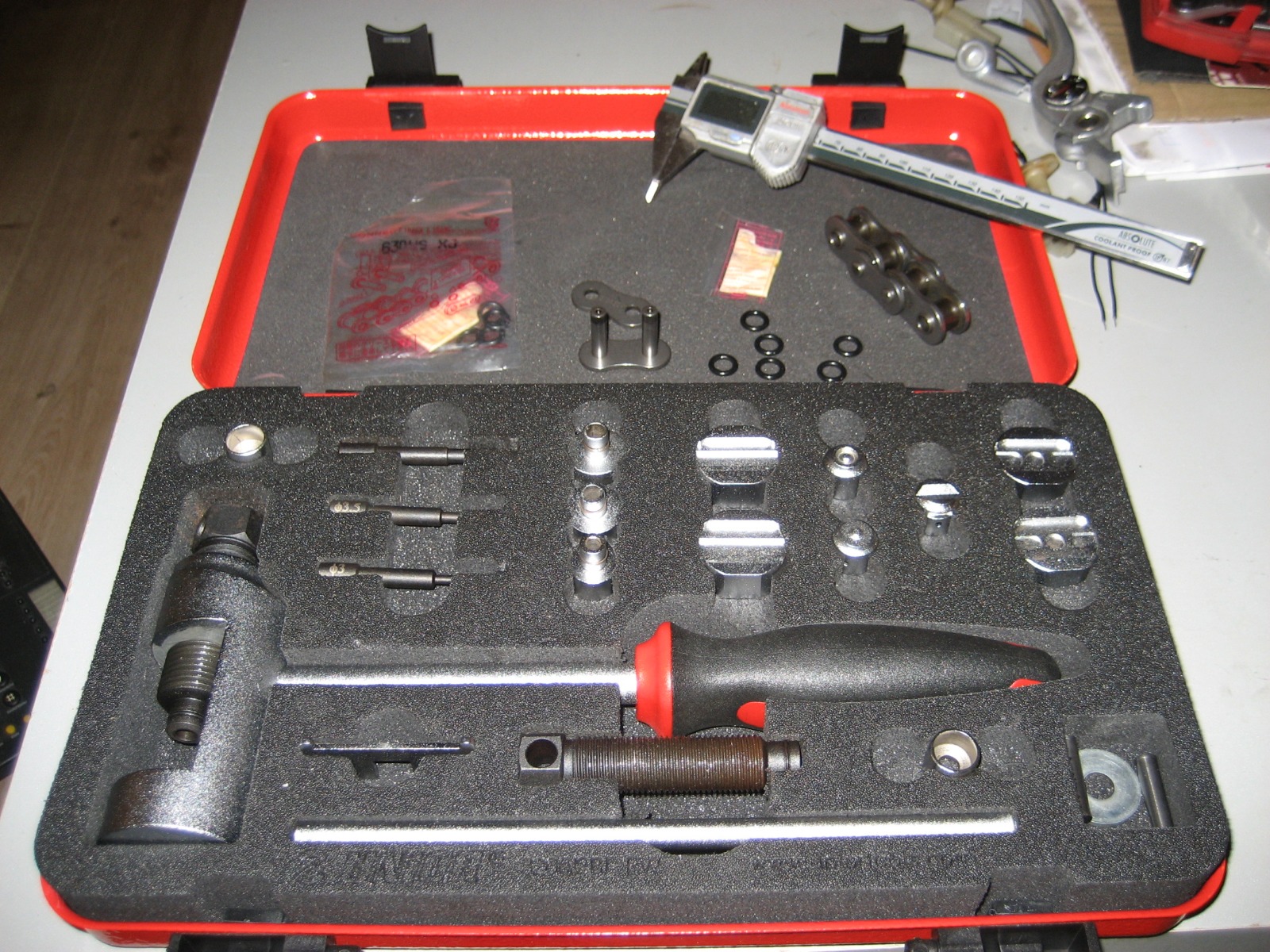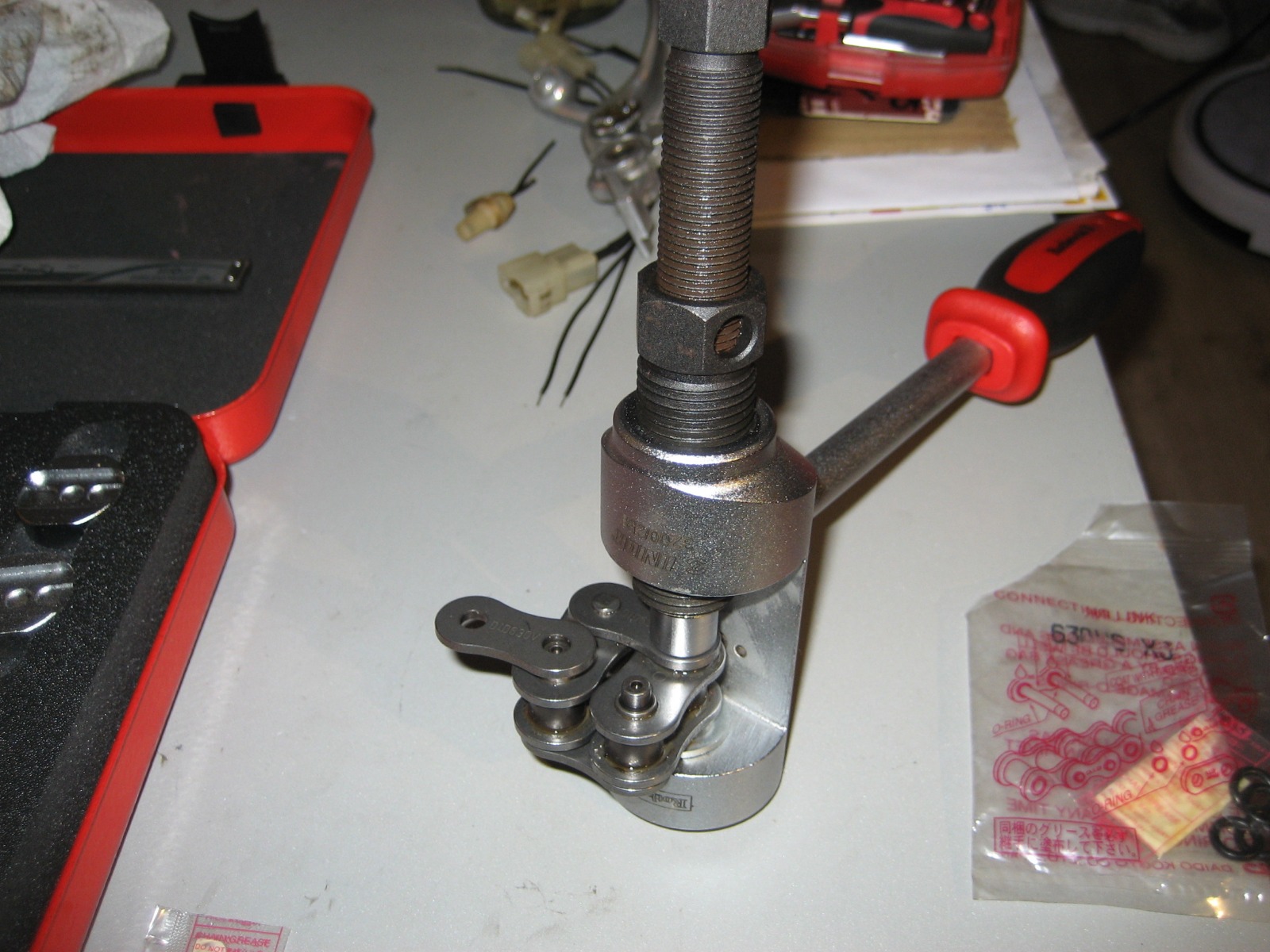 You can get a cheap chain tool from Cycle Gear or Amazon. They look beefy but the C clamp is made from cheese steel. Before using the tool to push out a chain pin you have to grind off the head of the pin to the greatest extent possible.