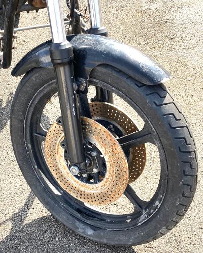 Someone had taken the time to put these drilled, thinner 5mm discs on and safety wire tie them up! And I see through the axle hole a nice newer blue sealed axle bearing. Plus this LTD style fender is fiberglass. This was on a 76 KZ900 frame. The rear wheel is a stock spoke. So who knows what the previous people had in mind?