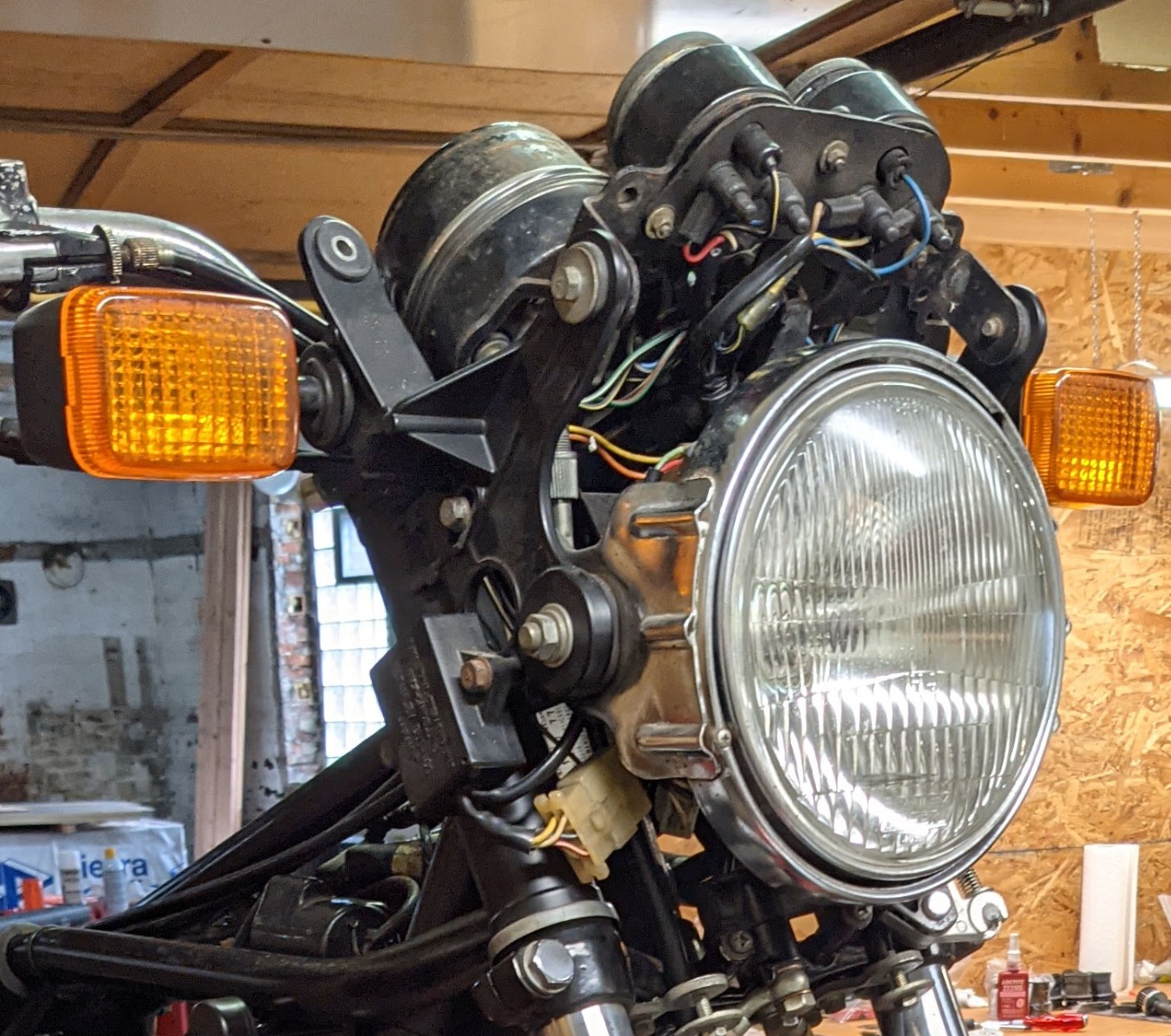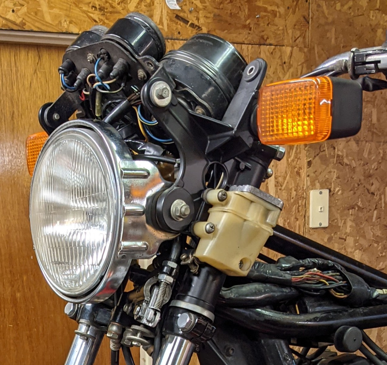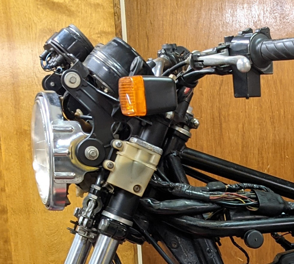 Ah my friend things make a lot more sence now, those kinda photos just do no exist on the Internet, Iv been trying to piece together how it all works in my head. I will be having a triple tree clamp made especially as im using 45mm showa forks, so i will design in the mounting holes. My a pieces will be cut from 5mm mild steel and welded onto 2mm tube with a 46mm i.d. The gauges are bought the cost a good bit but i want the real thing and yes i saw that Webike had a reproduction shroud for the gauges and ill ask Santa for that... i still have to make the final bracket for the cowl mount and turn signals but with your photos that makes the job a little easier. thanks!
