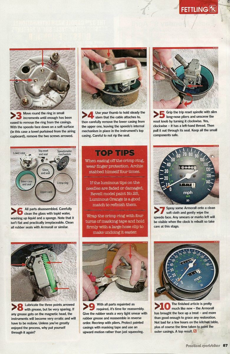 23 Oct 2021 11:17 - 23 Oct 2021 11:17Nessism is correct. I have my 750 gauges apart to freshen them up. Unless your experienced here just live with the ODM reading. You can destroy a good gauge because of a want. See red arrows of stakes that need to be releases to access the ODM spindle.A small screwdriver can be used to carefully pry off the metal band holding the speedo housing together. Work slow and bend a little at a time working around the housing. Once the speedo is apart it is possible to reset the mileage, although I can't describe the exact process. I think you have to further take apart the speedo by loosening staked tabs holding on the odometer spindle. Once those are loose the odometer can be removed and the mileage reset.