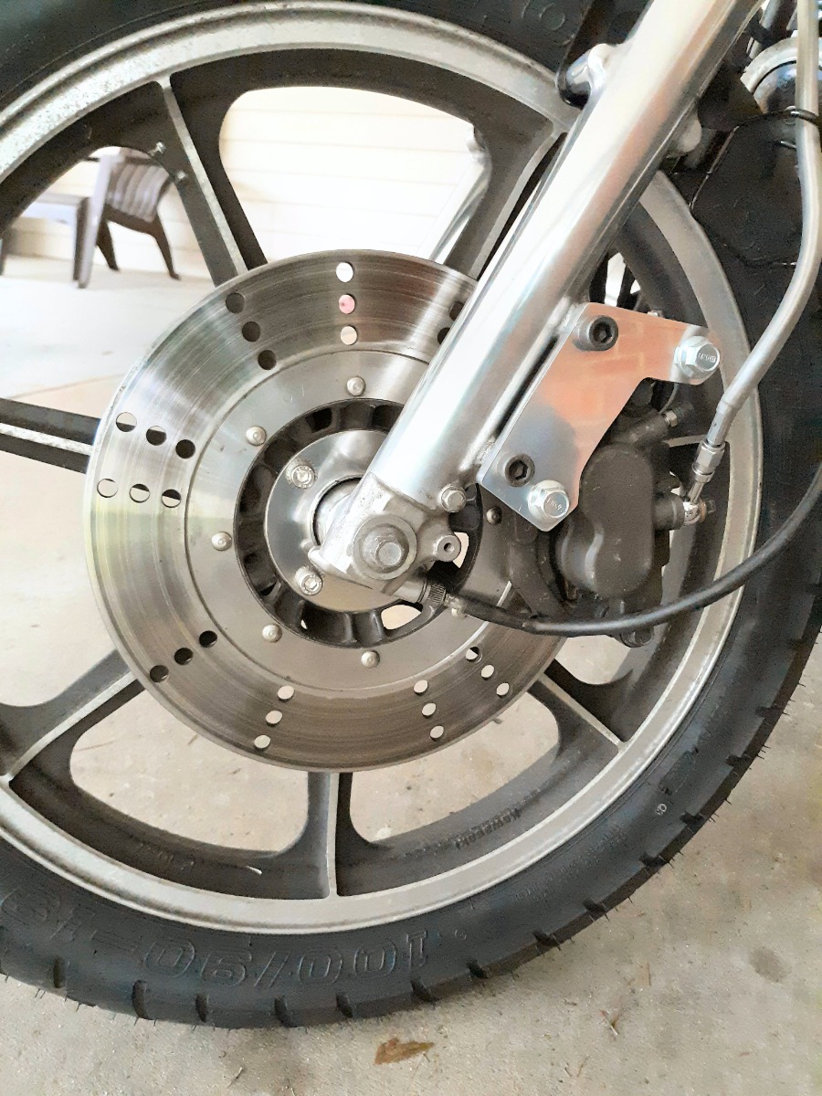 22 May 2022 16:39well shoot...not surprised though. There isn't much space to move the rotor either...rivets only leave maybe 5mm or so before they'd contact the caliper. No worries though. Think I read elsewhere that some of the early KZ1000's use the 4 bolt rotor that fit on the 440 wheel. If I can't get more braking from a caliper, a bigger rotor will work too.