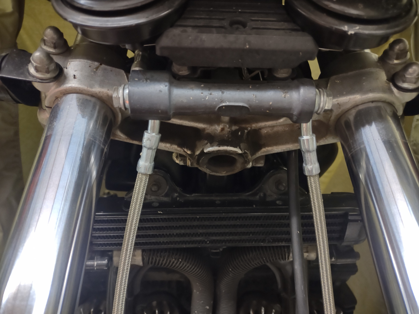 In the picture above, it looks like it would be possible to loosen the banjo bolts at the splitter and rotate the lines forward so the hose ends are perpendicular to the centerline of the bike, so the hoses go outward toward the forks instead of toward the engine. The banjo stops may have to be gnawed off to do that.