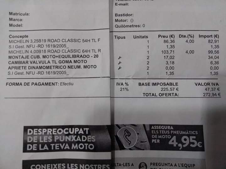 Soy cliente de la cadena de talleres RODI y allí llevé mi moto, cambio de ruedas, montaje y equilibrado me ha costado 272 €.