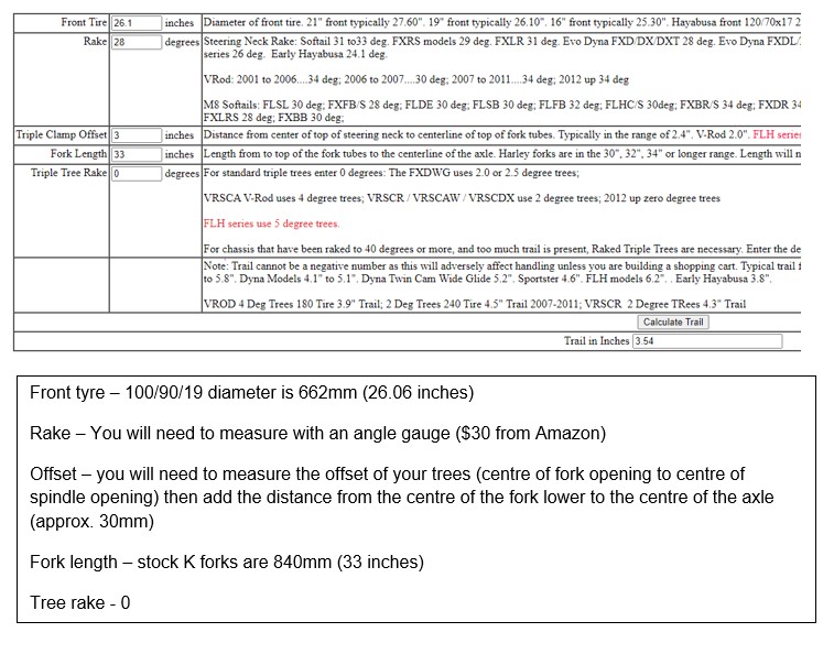 I'm not sure if I have all the numbers needed for that calculator. I suppose I could figure out the trail based on the numbers from the original J, then adjust for the leading axle fork. Is there any rake in the stock trees? Where would I find this type of information at?