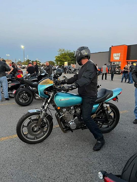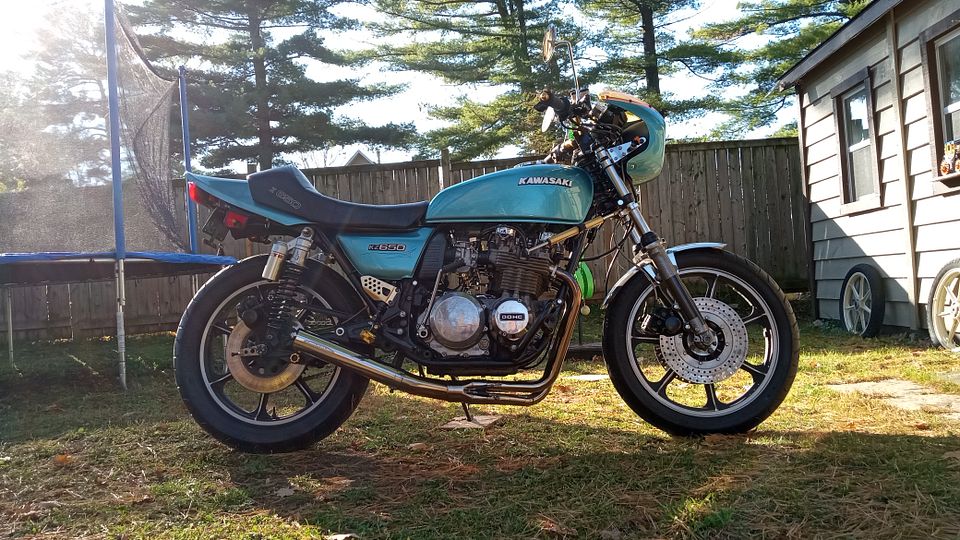 1978 KZ650 C2, 130K kms, Delkevic ex, EI, CVK32, PMC easy clutch, ATK fork brace, steering damper, braced swingarm, ZRX shocks, 18" Z1R front wheel.