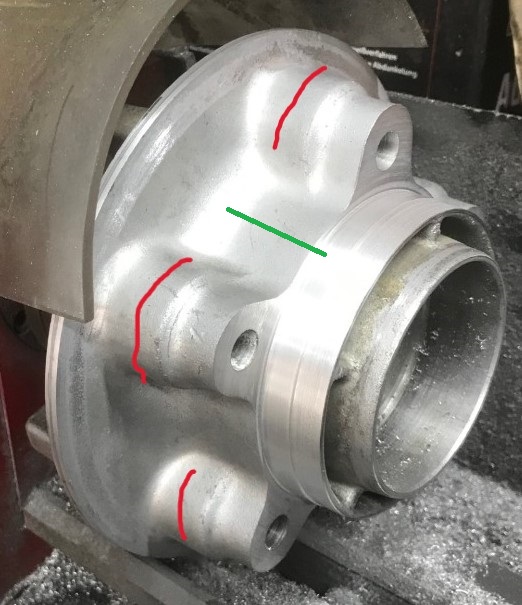 That green line follows a surface that slopes out (increases in diameter as it gets closer to the base). The casting wall thickness is roughly constant, so the inside wall follows the outside. If one were to continue to cut that center hub surface (centering surface for the sprocket) straight down, at some point it would cut through the casting wall and the entire center bearing carrier would fall off. It may still have enough meat for the bolts that hold on the sprocket, but I think it wouldn't be very useful without the bearing.