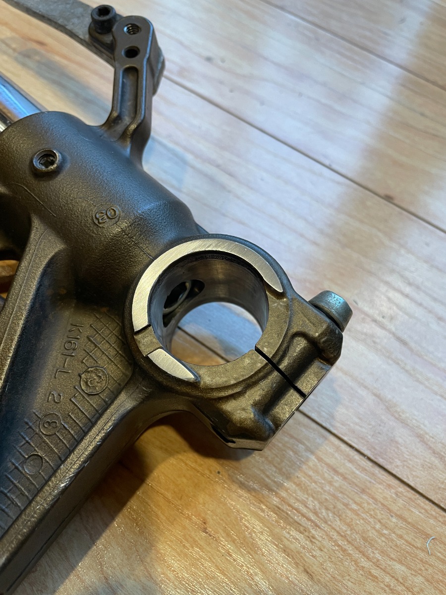 You can see in some of the pictures that I have 3D-printed prototypes of custom triple trees. The biggest part of this project has been designing, prototyping, redesigning, prototyping, and ultimately finalizing a design for custom triple trees. This was done because again, there was no off-the-shelf option. I wanted to maintain the exact steering geometry and wheelbase of the bike. In order to do that I came up with my own design for triple trees, modeled after a hybrid of the stock parts, sized to fit the larger forks, with some design elements pulled from the donor front end's lower triple. The upper triple includes a 10mm drop, which serves to lengthen the forks, and allow clearance of the fork caps under the stock handlebars.