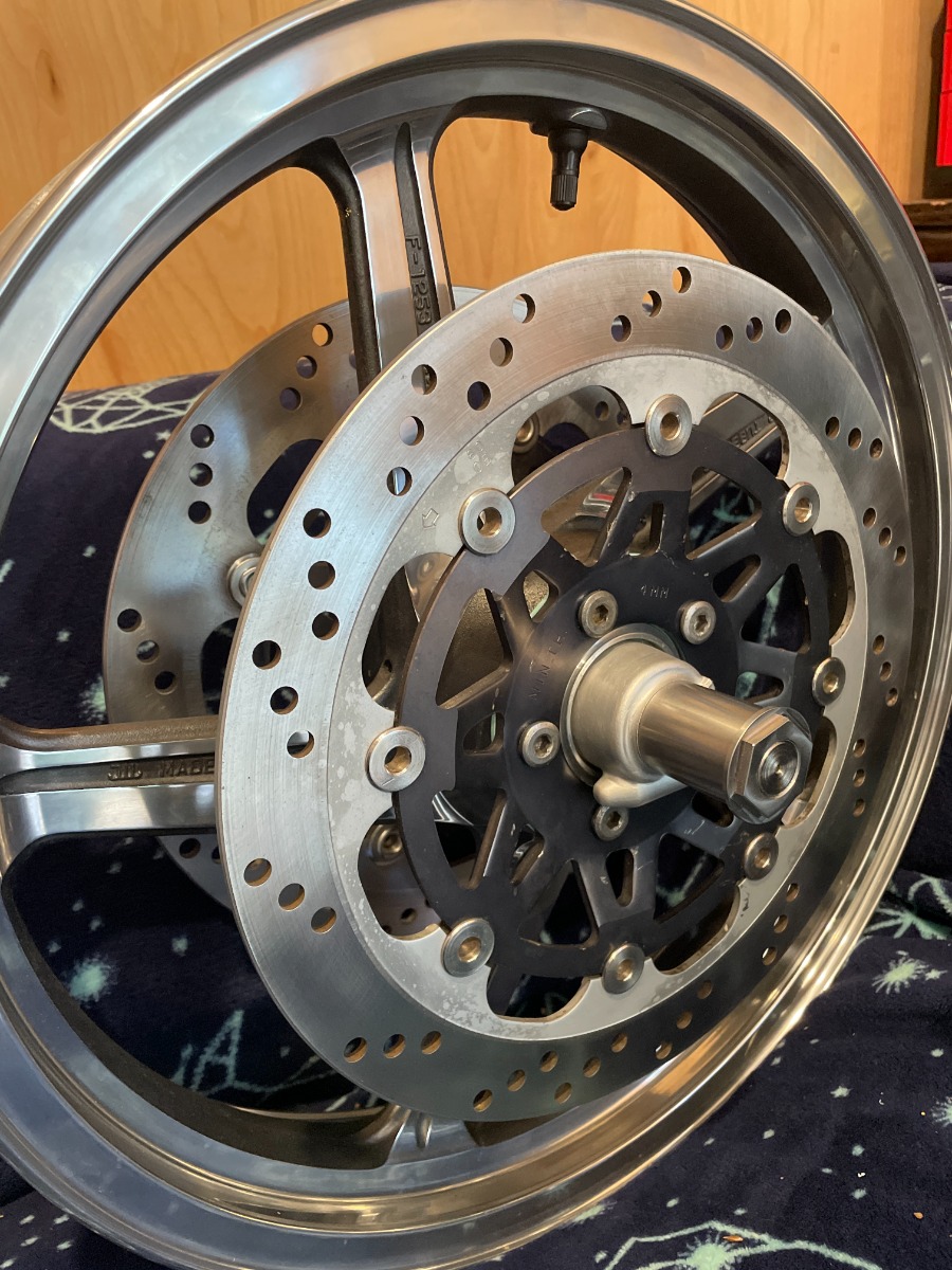 There were few off-the-shelf components that would make this a simple plug-and-play situation. I have sourced a custom axle from Spec Engineering in Japan via Webike, made custom rotor spacers via SendCutSend, determined that bearings, axle spacer, and speedometer drive from a ZX-600, and rotor bolts from a Suzuki would work, had a fully-custom left side axle nut made, and rebuilt the '03 ZX6R forks with (again, fully custom made) damper rod extensions. Here are some photos in probably non-chronological order.