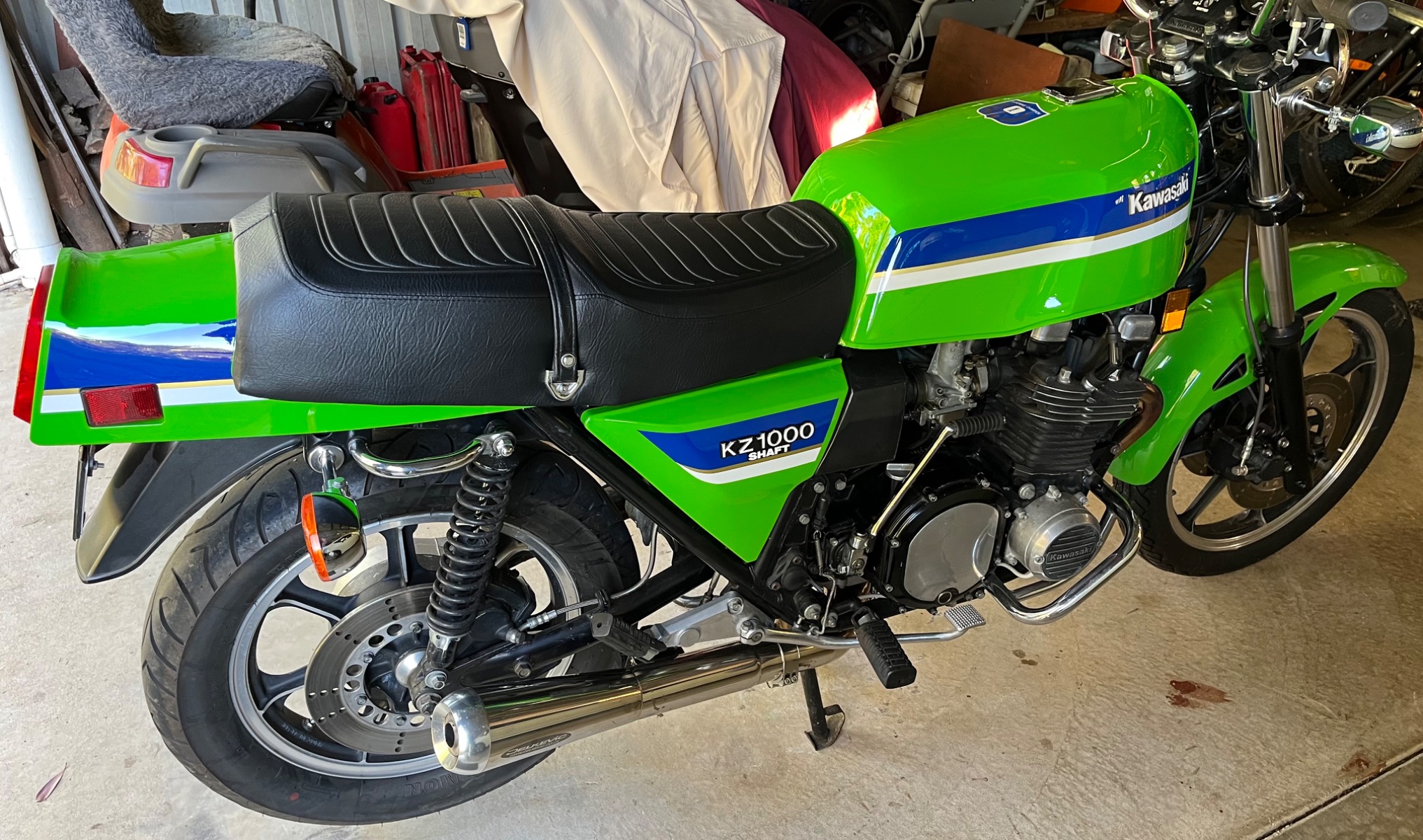1978 KZ650 C2, 130K kms, Delkevic ex, EI, CVK32, PMC easy clutch, ATK fork brace, steering damper, braced swingarm, ZRX shocks, 18" Z1R front wheel.