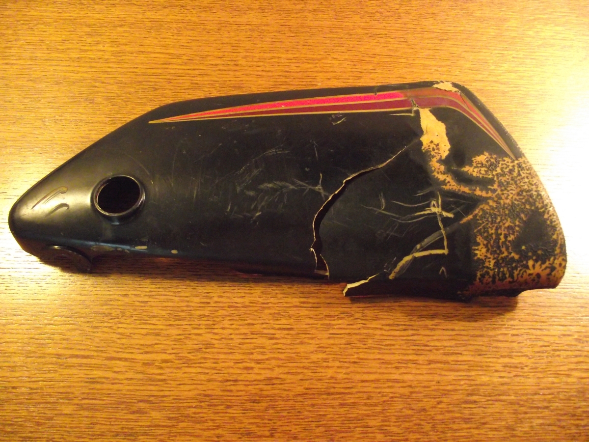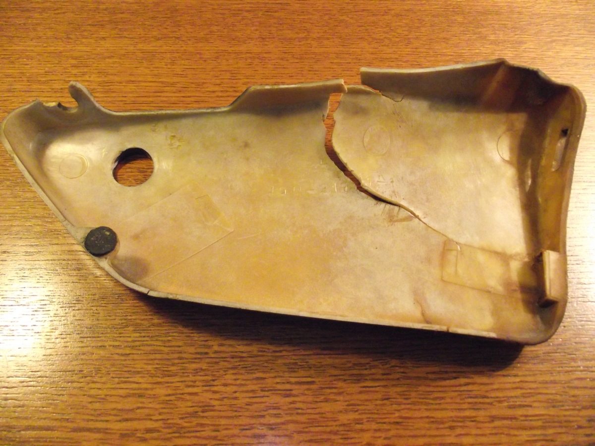 Here is what I'm going to attempt to repair. I plan on using the Permatex Plastic Weld or the Loctite Plastic Bonder (both are about $6.00) along with a fiberglass backing. I know it looks crazy to even attempt to fix this. But these panels are very rare and would cost me $100 plus to get a used replacement, $200.00 for the set. Plan on fixing this one and biting the bullet and purchasing the right panel.