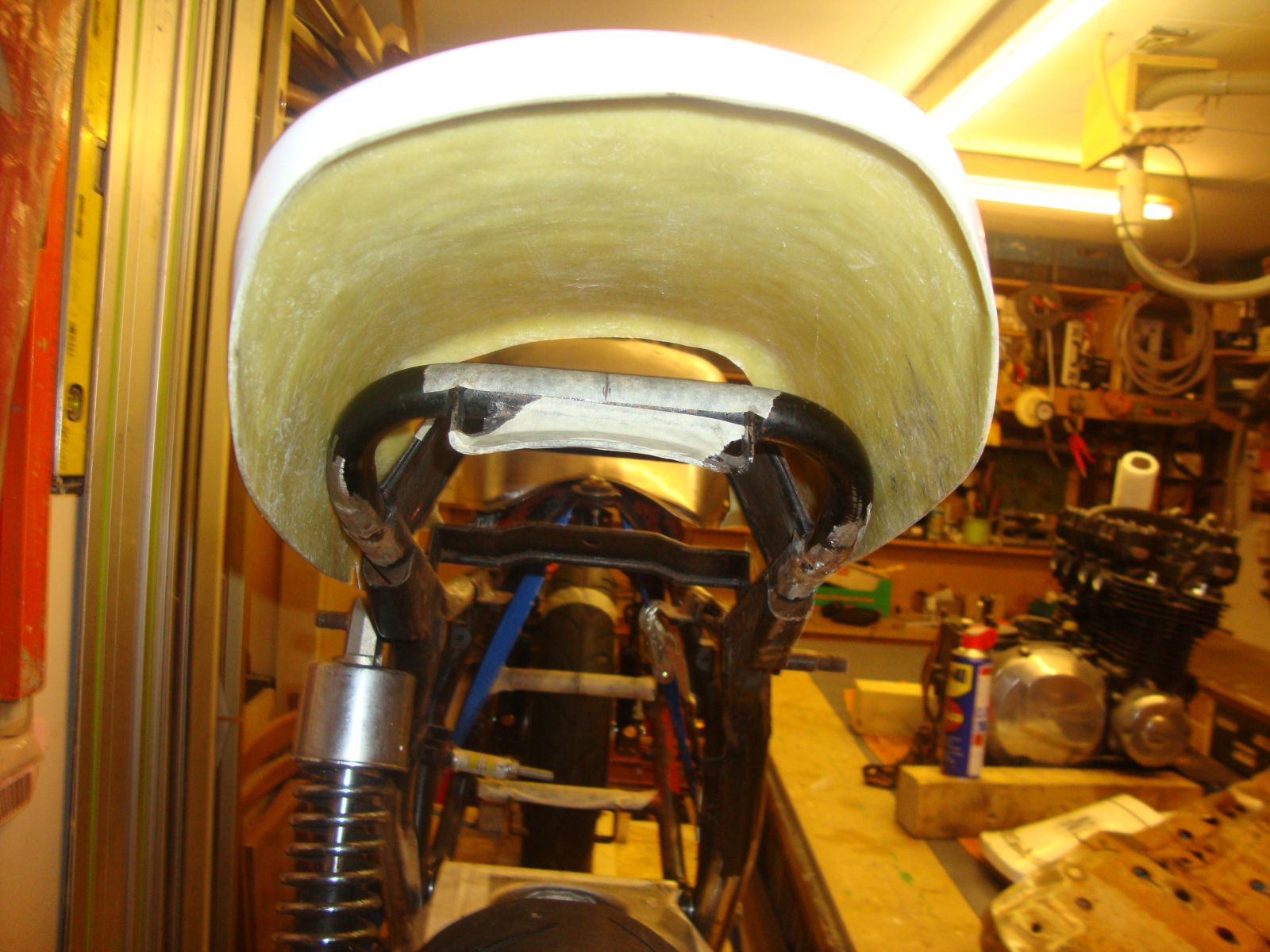 So I bought a fiberglass repro 900/1000 ducktail which comes nowhere near fitting as is.Ive had to slice it down the middle just to get it to fit over the frame.