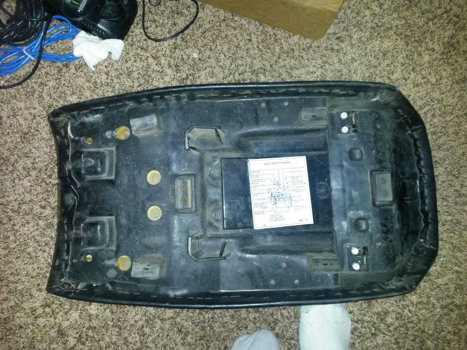 I had to remove the front pads to get the front tangs to engage but they did nicely after that. The seat is flat at the back so it interferes with the grab bar and tail piece so i wasn't able to lay it flat, I'll have to trim it back an inch or 2. The latch loops are too far forward but I should be able to move them back and maybe use spacers and pads in certain places to get the seat to sit even and flush. i plan on converting this to a solo seat/tail rack similar to this but more practical than pretty.