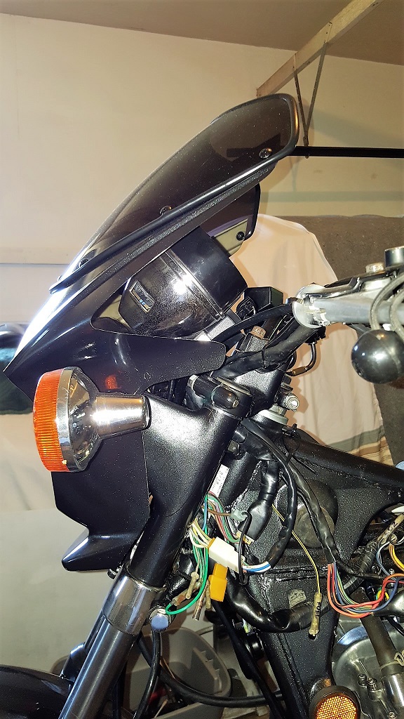 This shows a profile view of the fairing. Notice the turn signal stem mounts and also clearance to handlebar and cables etc: