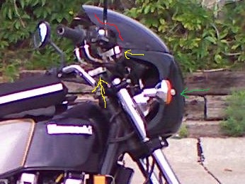 Yellow points to the aluminum strap that is bolted to the handle bars with pipe clamps and the fairing windshield screws.