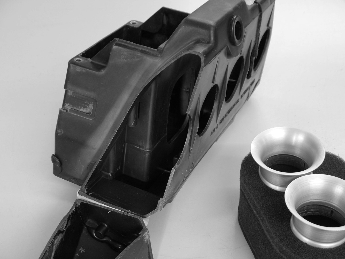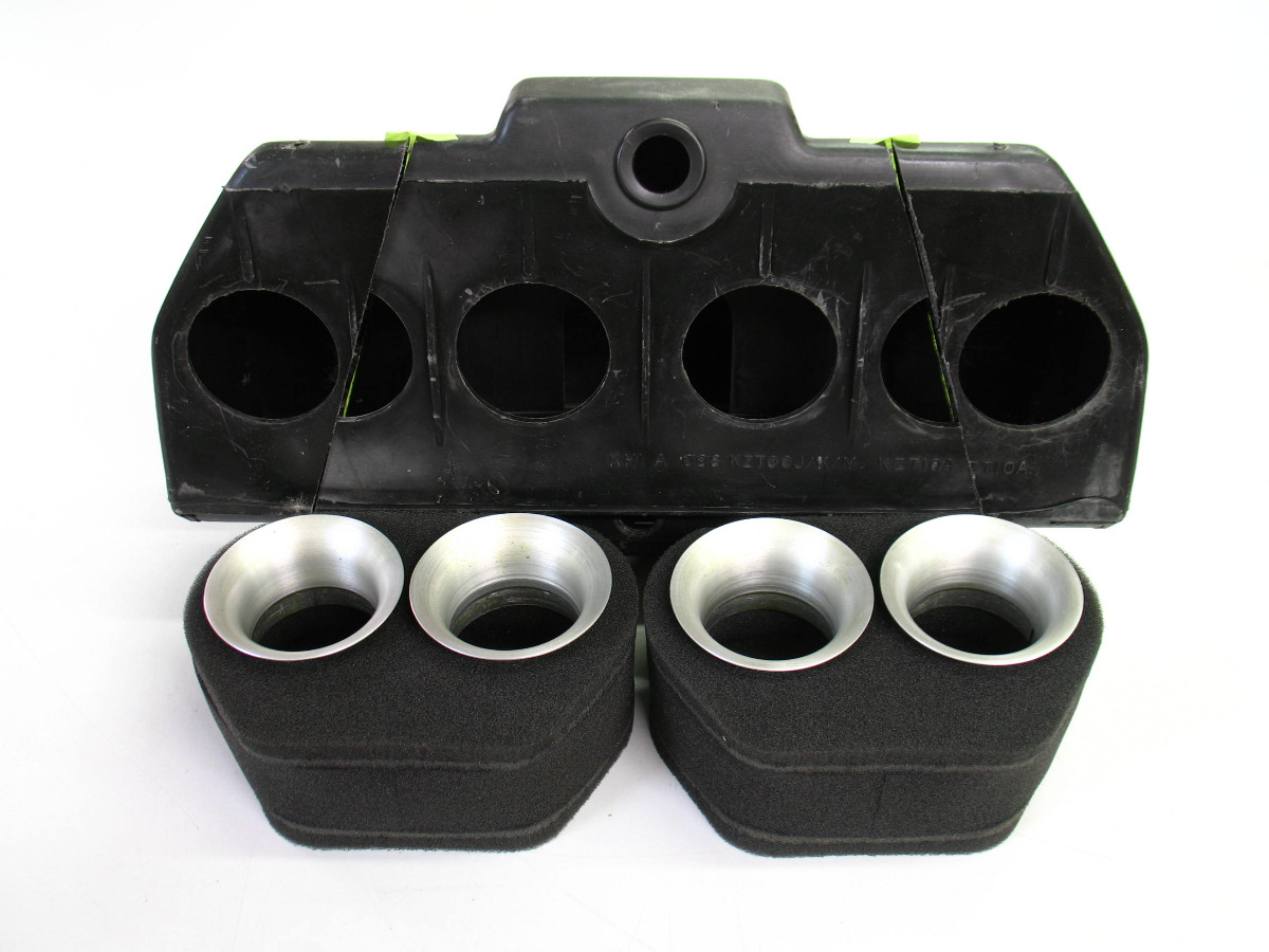 I hope to make one widened air box (from two) to accept 70mm long velocity stacks straight off the carbs, or Pipercross foam filters with shorter stacks, fit into oval shaped holes in the air box face. It would still look stock, having the original chrome covers and frame-attachment fittings for support.