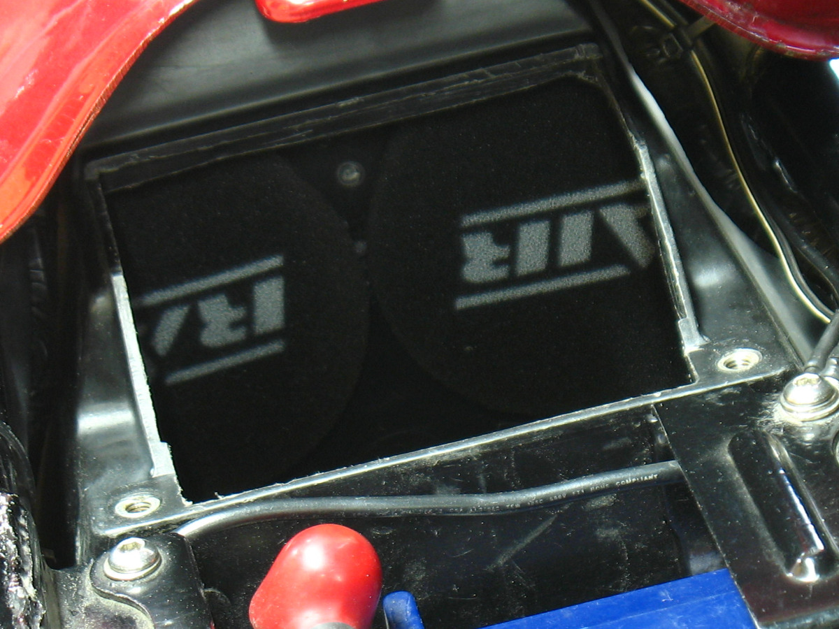 The new 50mm stacks open just inside, so I can stuff most of the filter material in there too. :woohoo: To install them, the stacks/filters were passed through the openings and attached to the carbs from inside the air box, since there is not enough space on the carb side to fit them. :ohmy: