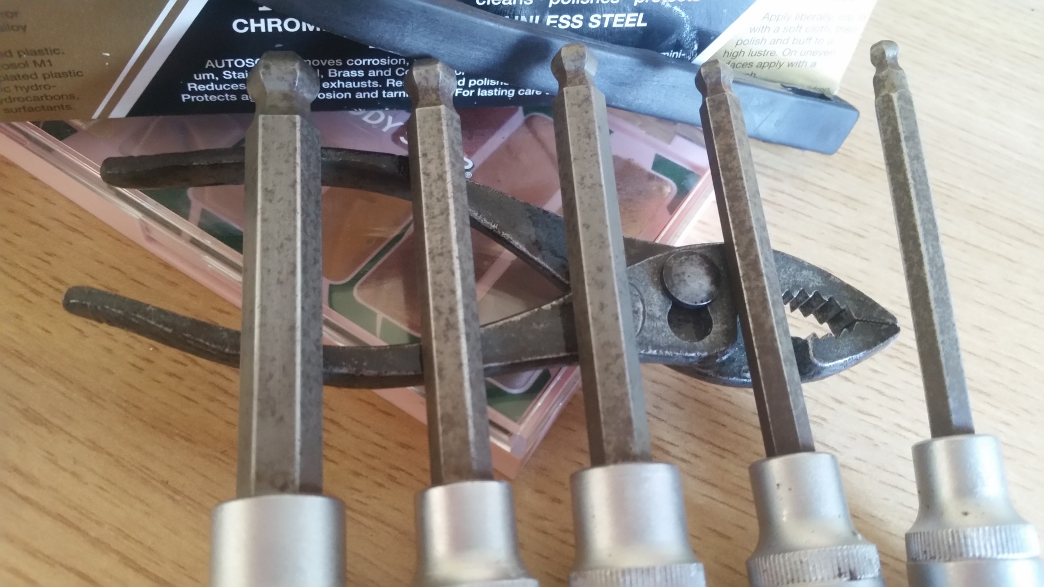 Mixed results!! After scrubbing I filled up the tray with very hot water and left for an hour then I thoroughly rinsed and dried everything and this is how everything came out, some things did better than others, I'm sure a wire wheel would improve things more and perhaps a metal polish but to be honest I'm surprised what the bleach did to these bits, it could be a useful technique on rusty exhausts and things?