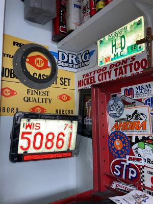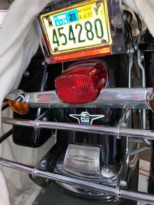 Thanks Rick, Yes OEM alarm from 75. And this was an old New York plate that was on my 1stlegal road bike! A little Suzuki Trails 90cc in 76, then it went on a KZ900 in 77. So glad I saved it. New York lets you use old plates as the bike is registered Antique. And the OEM Eagle in correct place on fender. That FL has not gone over 50 MPH in 20 years! Everyone tossed them alarms! They put them on Sportsters too! Still has the little vials of MERCURY in them. Check out my wall with one of the alarms. Has a Wisconsin Plate (Milwaukee-HD) & 1974 (1200cc =74 Cubic inch) How cool is that for an old Harley collectible item. Yes mini bike has a scrub brake. Here was the finished product. The handle bars are 1" on these things So I have white HD coke bottle grips, and a white brake pedal rubber from a Superglide. foot pegs have white bicycle grips. That's my grand daughter and son. Reason I built the mini bike. I had the blue paint so I used it. Plus I painted the helmet to match. Pics are from 2015.