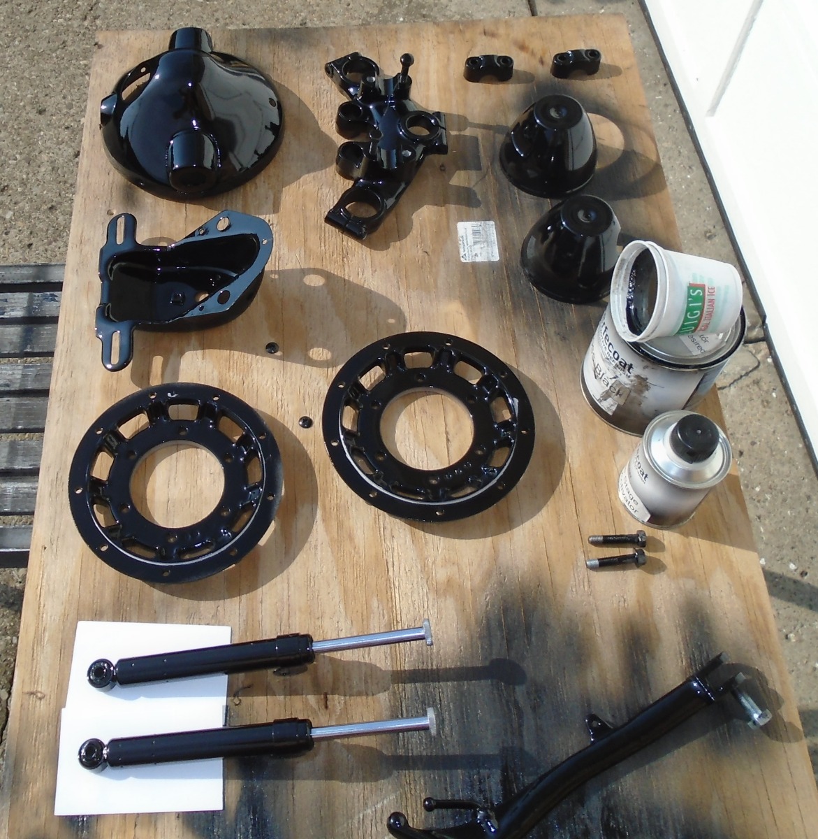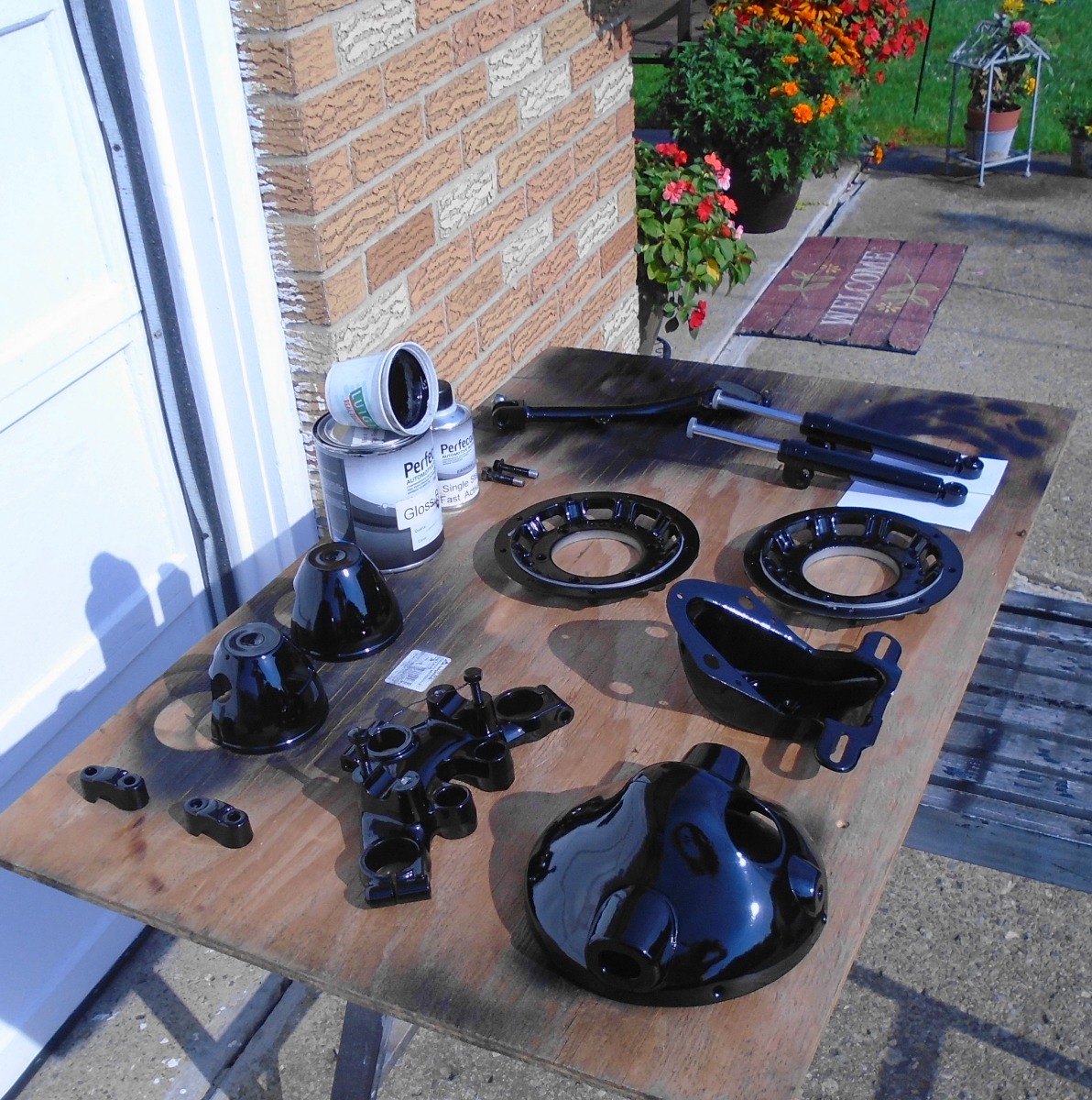 Used this cheap single stage urethane 4:1 mix, out of the gun and done! Bought this paint on ebay, it was $46 bucks to my door. 40 ounce's of sprayable material, you can even thin a little if you want. I did this quick, not going to be keeping these items.