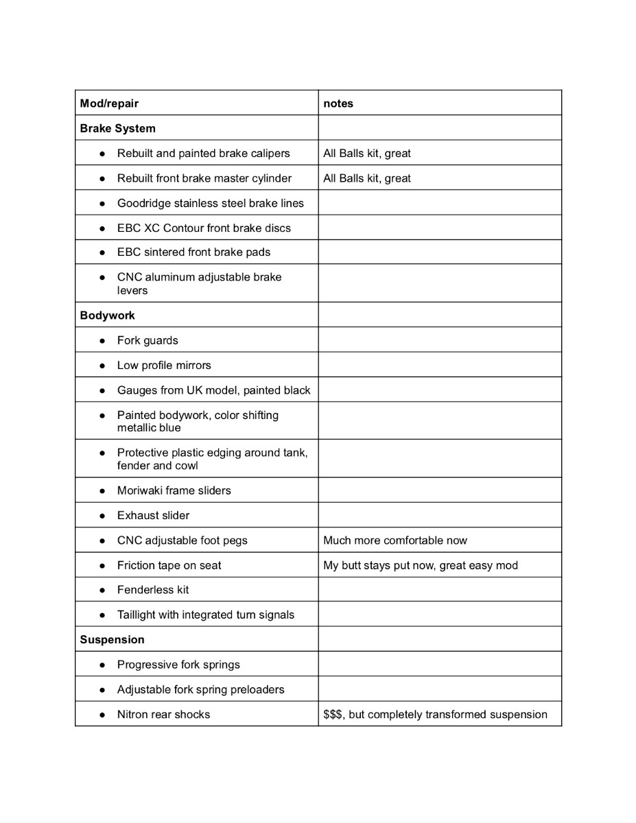 Most of the mods and repairs I've made to the bike. All worth it in my opinion - maybe will give you some ideas?