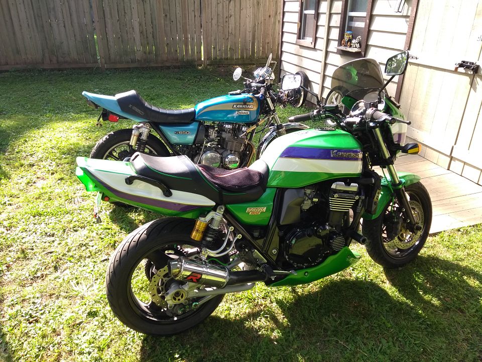 zrx 1200 for 5 years , paid 5 k sold it for the same price but in 5 years they gone up quite a bit , sorry I sold it but fell in love with the lowrider s , and bought that and I’ve had it for 5 years now and the bike on nada quide is 2k over original sticker price . What part of Ontario are you from , I’m in Montreal , the pinstriping I got at Canadian tire for 10 bucks . You did a beautiful job on your kz