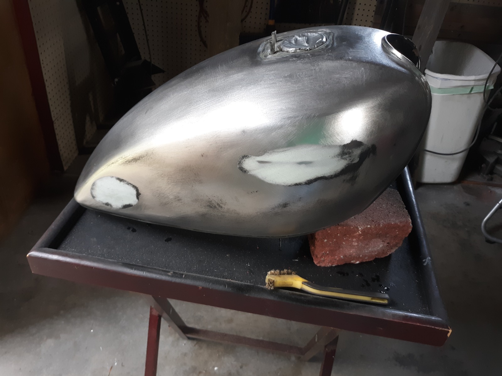 Here's where I'm at...watched a few videos on using guide coats, foam blocks to sand contours, etc.dents are filled but for the tank badge bracket, should the bondo be spread out a bit further? I can just make out the top edge & one end of the bracket but I don't feel them. Everything feels smooth, no ridges or obvious low/high spots but I've never done this before. The black is what was left from spraying a guide coat.