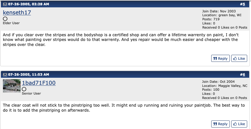 Several notable vintage car and motorcycle painters have said they prefer to put VINYL pinstriping OVER the clear. This from 2005 but there are TONS of the same comments made from then until now.