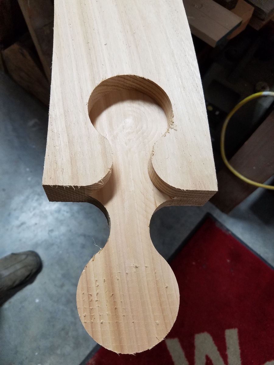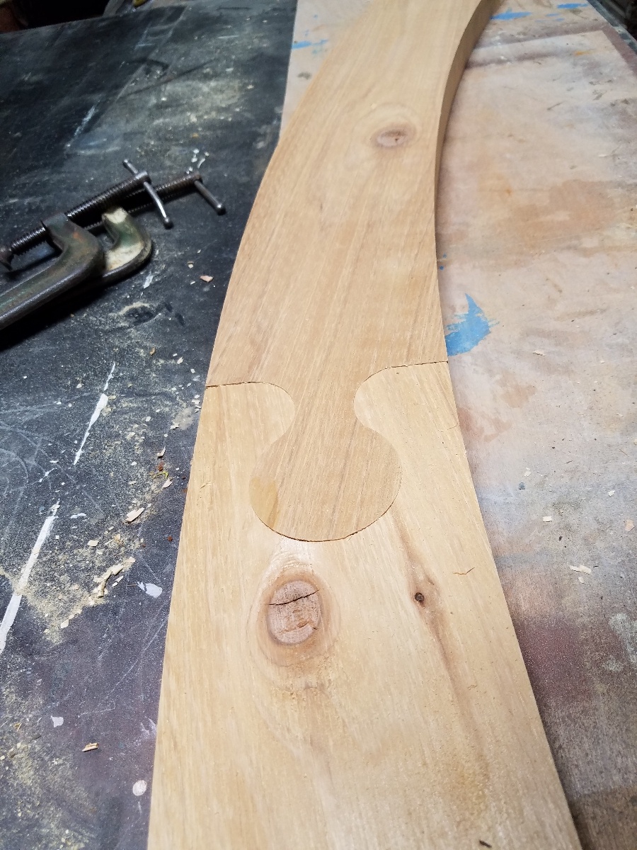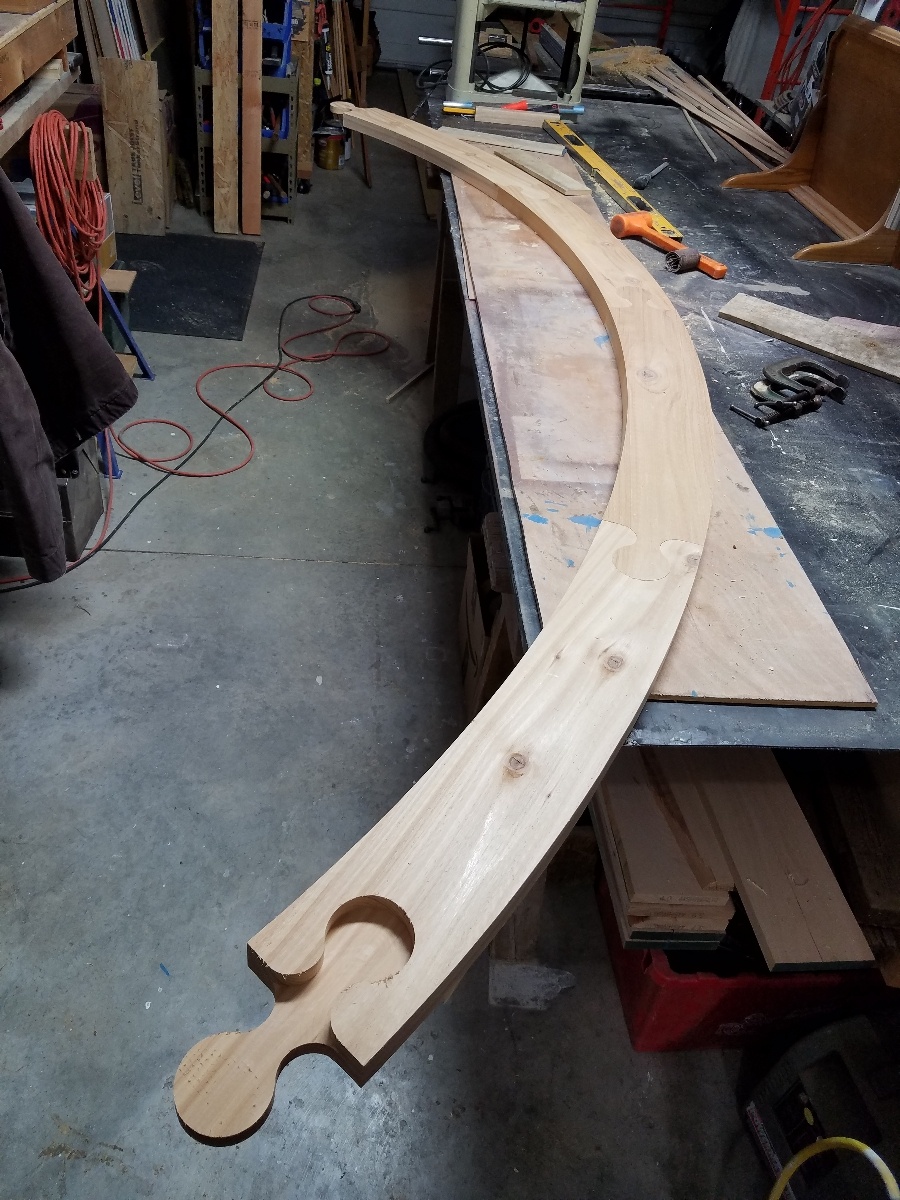 Until now I'd only used bulb joints to make picture frames and various cabinet / fixture types of projects. This fall I decided to venture out into the realm of structural applications by building an 11' by 16' shed that will have a barrel shaped roof. The picture above is of two 2" by 8" pieces of Douglas Fir that will join four other pieces to make one complete arched rafter.
