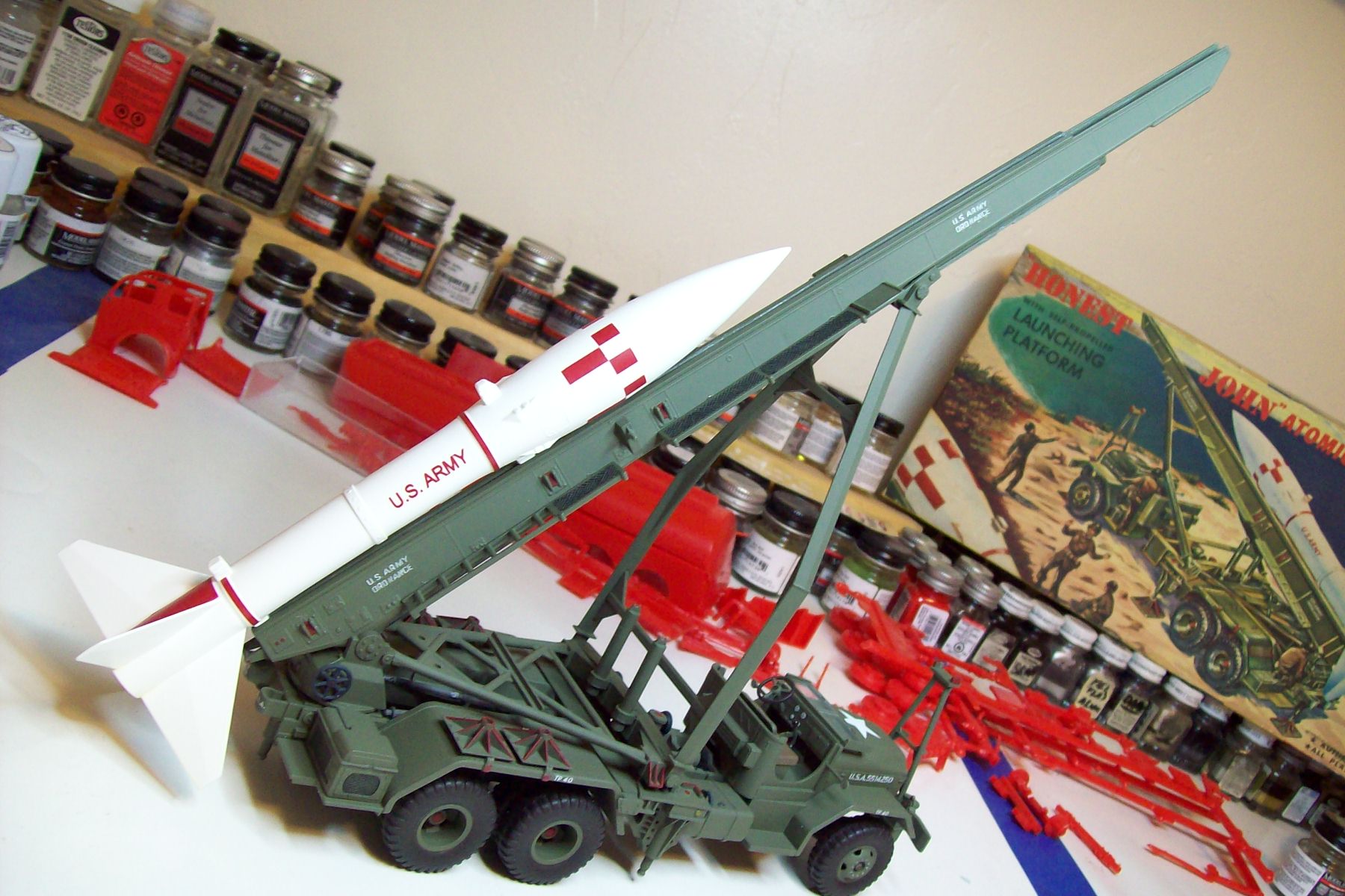 Just finished my latest nostalgia build, the 1957 release by Adams of the Honest John atomic rocket and launcher. This kit was one of the very first models I can remember building back around 1961 or so!!! Bet there are a few of you out there that built this very same model kit back in those days too!!!!