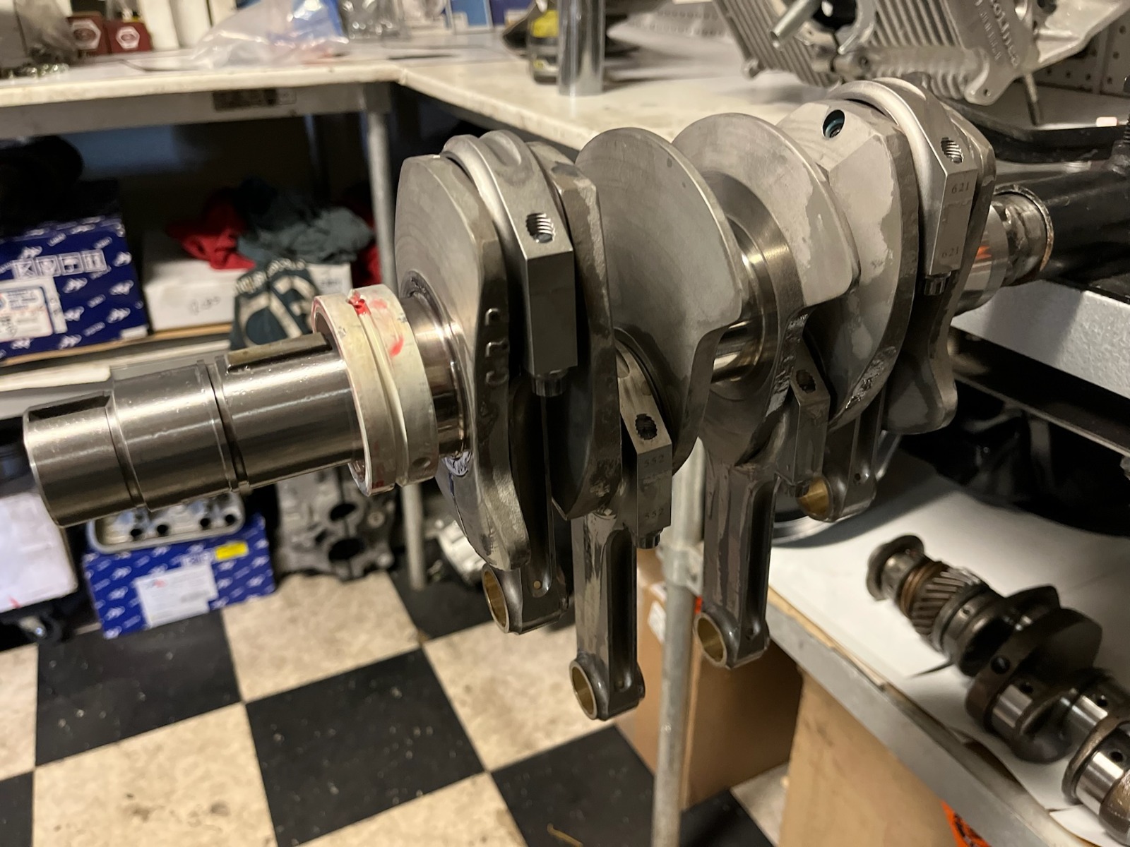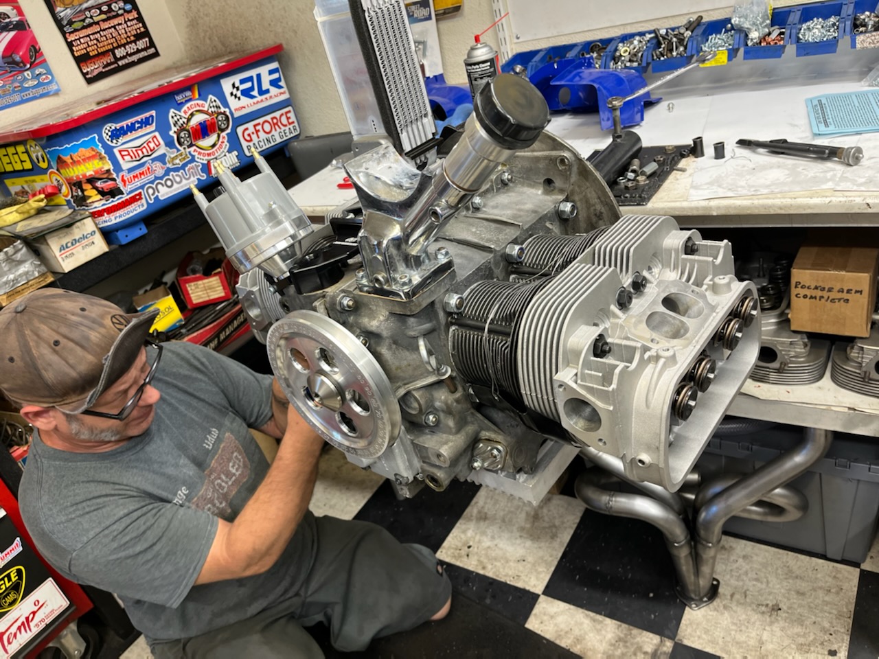 The engine is a 2275 using 94 mm pistons and an 82 mm crank. An Engle 125 with 1.25 : 1 rockers giving about .550 lift at the valve. The heads are stage II wedge ports with 42 intake & 37 exhaust valves. 44 carbs on match ported manifolds and 1 5/8 merged collector. Hoping for 150-160 HP in the buggy