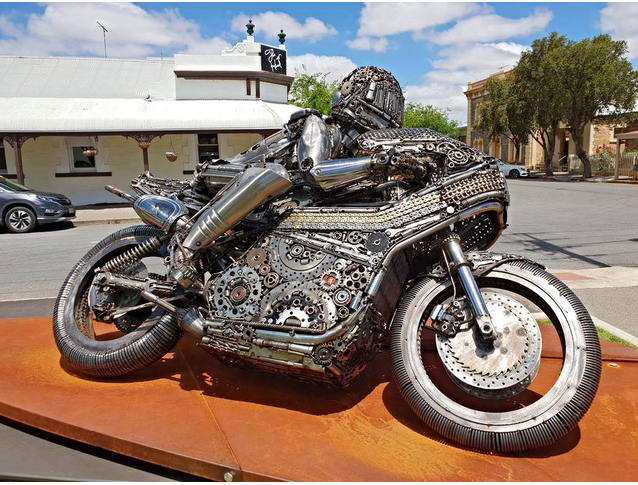 A local sculptor has produced this piece portraying local motorcycle champ Kenny Blake riding his RG 500. Very very cool!