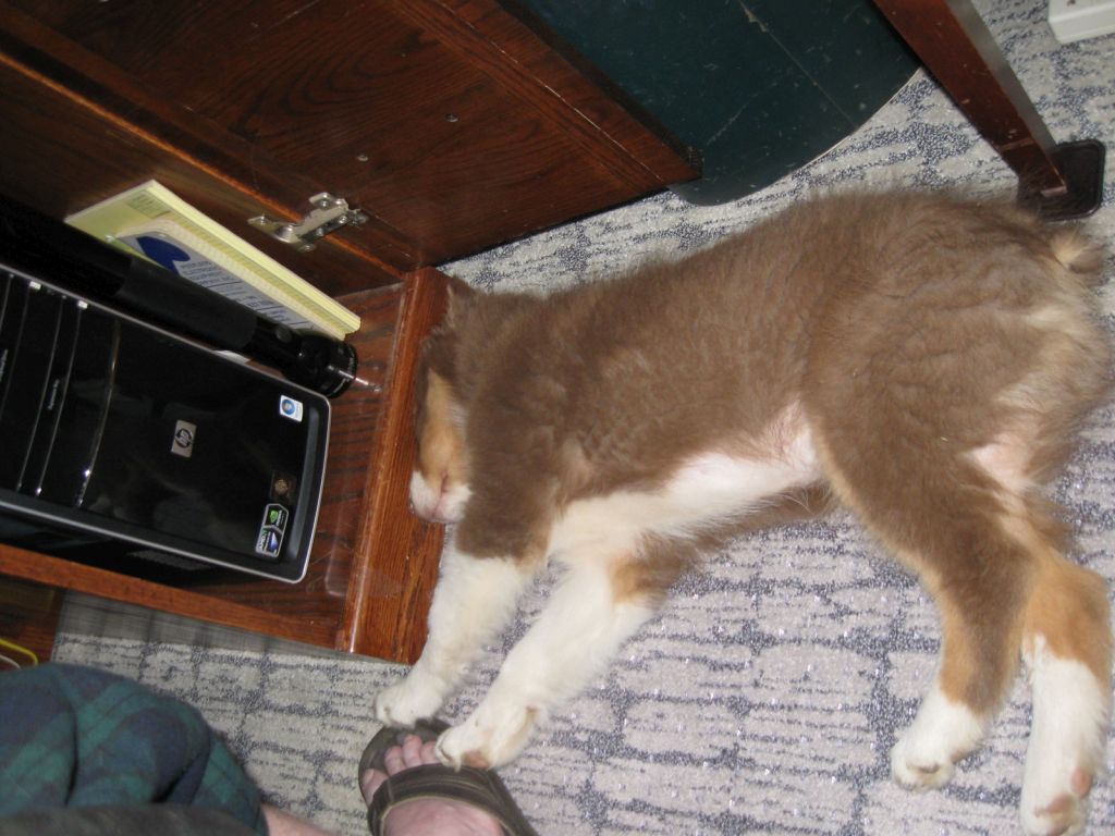 A main logistical challenge was what to do with all the 'puter lab furniture, as well as the guest bedroom furniture. Everything had to be moved out of both roome. The question was where to put three desks, seven computers, three printers, two MFP's and three chairs, plus a rats nest of CAT. 5 cabling and assorted hubs, switches, two routers, the home node of the mesh wireless network, and four UPS's, while still maintaining minimal broadband connectivity. And that's just the 'puter lab. In order to empty the computer lab we had to empty the spare bedroom for a minimal network, because that was the closest to the existing broadband jack.
