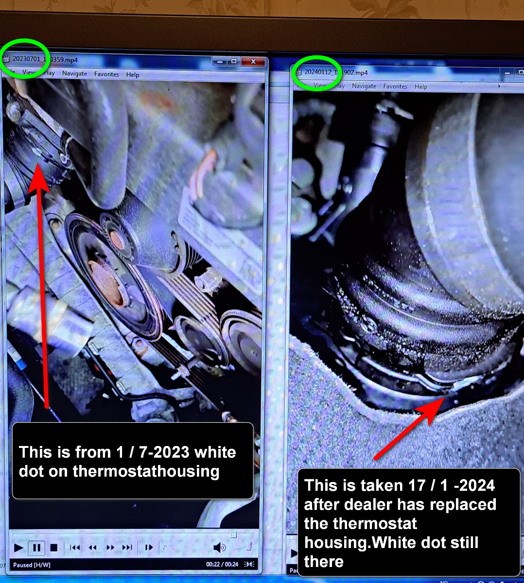 Now im really pissed off because i also discovered that they had not replaced the thermostat housing as they made me pay for.I know that because in july i did a big service on the car and took some videos down in the engine compartment.On the video there is a white paint spot on the thermostat housing and that is still there so they have not changed that.I then started to check more and took off more parts on the engine to se if they have replaced the injector.All looks new in there, but i can see that they actually have changed one injector ,but i am 100% sure it was not neded.