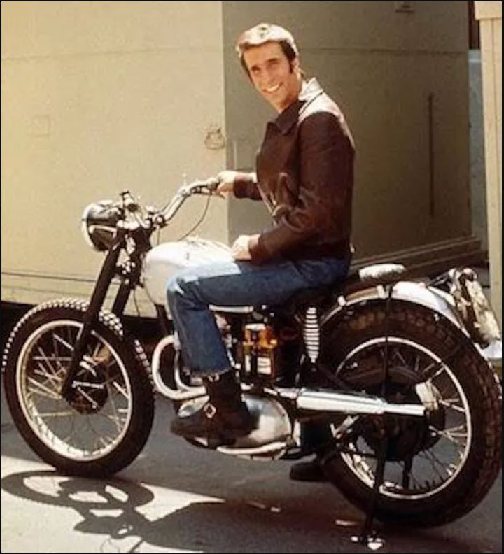 This pic is not a Funny but I'd bet we'd have fun picking a punch line for it. I read that Fonzi rode a 1949 Triumph.