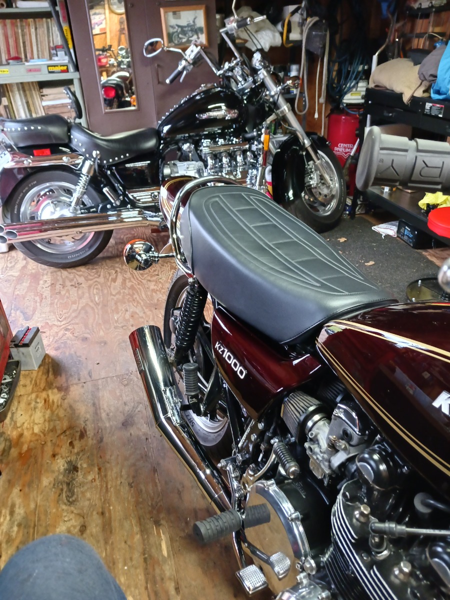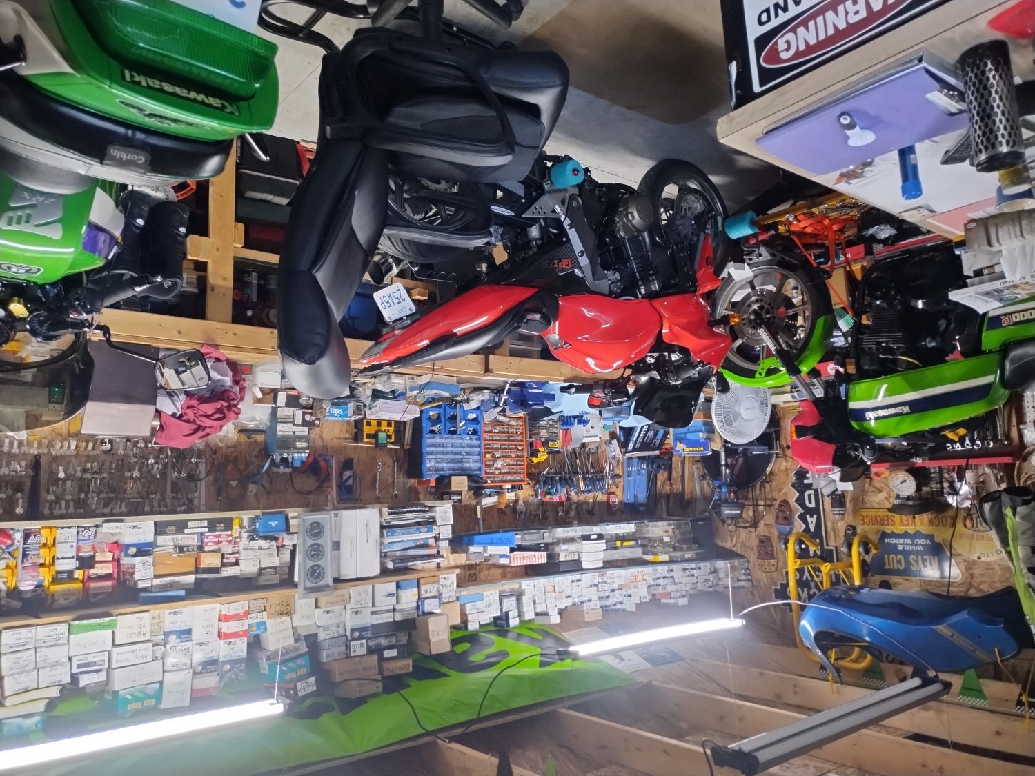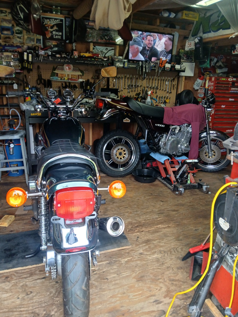 I have some buddies that have garages or shops that are crazy nice. Me, I have a 12x16 shed i call my saki shed. Being retired now 3 years and seemingly beating prostate cancer i value my shop so much more. It's my space and I'm comfortable in it. The Mrs says how can you spend so much time in that shed,with those smells and all that. But then she sees the bikes that have come out of it and are now back on the road and some with new proud owners,she gets it.