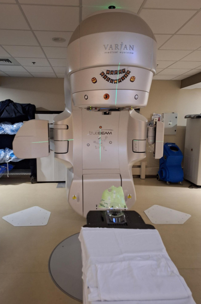 It was Halloween season when I took that pic. If you zoom in, there’s a Halloween skeleton to be seen on the main body. Dark humor from radiology Techs. The ghostly green thing at the head of the table is the molded mesh mask used to lock my head into the clear plastic cup for exact beam targeting.
